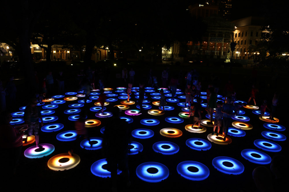 The Pool consists of concentric circles created from interactive circular pads. As multiple users play in The Pool, their interactions become mesmerizing patterns of shifting and fading colors. The Pool was built and designed as a traveling work of art, it has been exhibited internationally, most recently at Abu Dhabi Science Fair in Abu Dhabi, United Emirates, the Istanbul Light Festival in Istanbul, Turkey, and at Burning Man Festival at Black Rock City, Nevada.