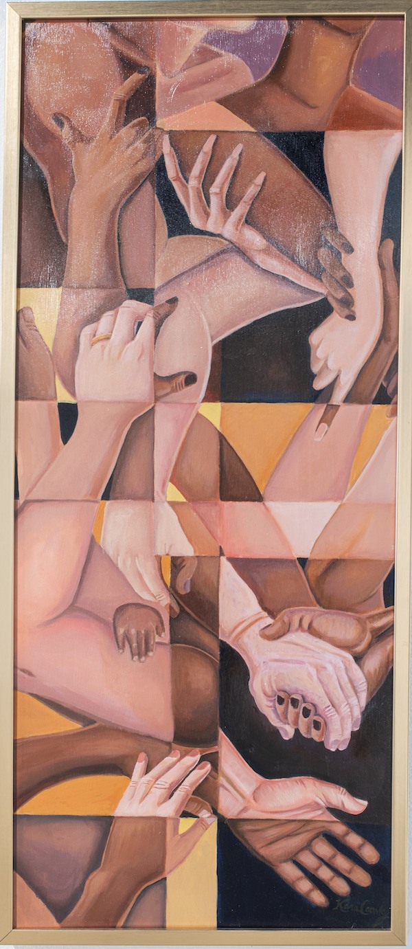 “Exertion” focuses on the mental and physical support of Americans through hands of togetherness. I believe that we can become whole, despite race or age for the sake of humanity. The hands in my piece symbolize an act of unity, similarly to how hands grasp tightly to one another. Both of the perspectives of those that are youthful and elderly lead to greater paths of guidance. From one person to another, love is shown by touch during difficult times. I believe that the true source of power in America is through the motion of hands instead of words.