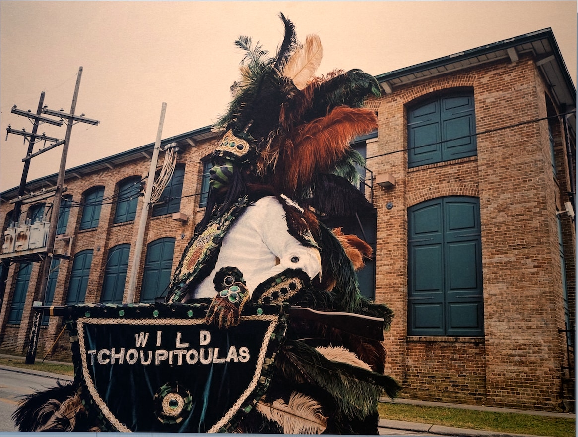 On Mardi Gras Day in 2020, Flag boy Giz unveils his new Wild Tchoupitoulas Indian suit which was sewn and beaded himself. This image displays the preservation as well as progression of the historical culture of the Indian tribes of New Orleans.