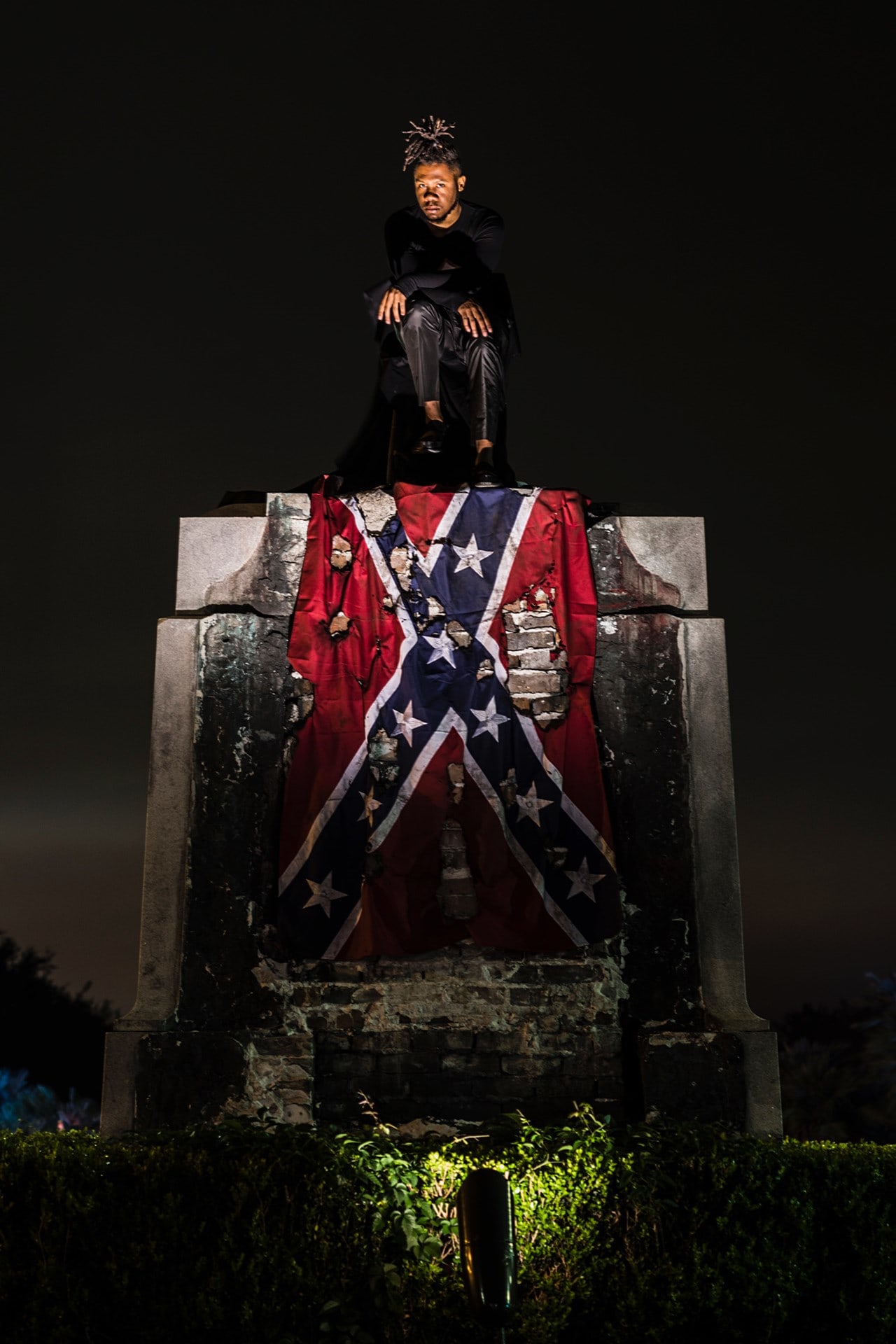 Print of time-based performance piece conceived by Ti-Rock Moore that took place atop the vacant plinth of General P.G.T. Beauregard—the general of the Confederacy who led the creation of the Confederate flag. Through the reclaiming of this land and the literal dismantling of the Confederate face of oppression, “New Wars. New Stories. New Heroes.” seeks to combat the illegitimate foundations of a paradoxical nation. The fact that this statue and plinth existed on former plantation land in front of a museum which continues to grapple with its racist and colonial roots compounds the narratives explored within the piece.