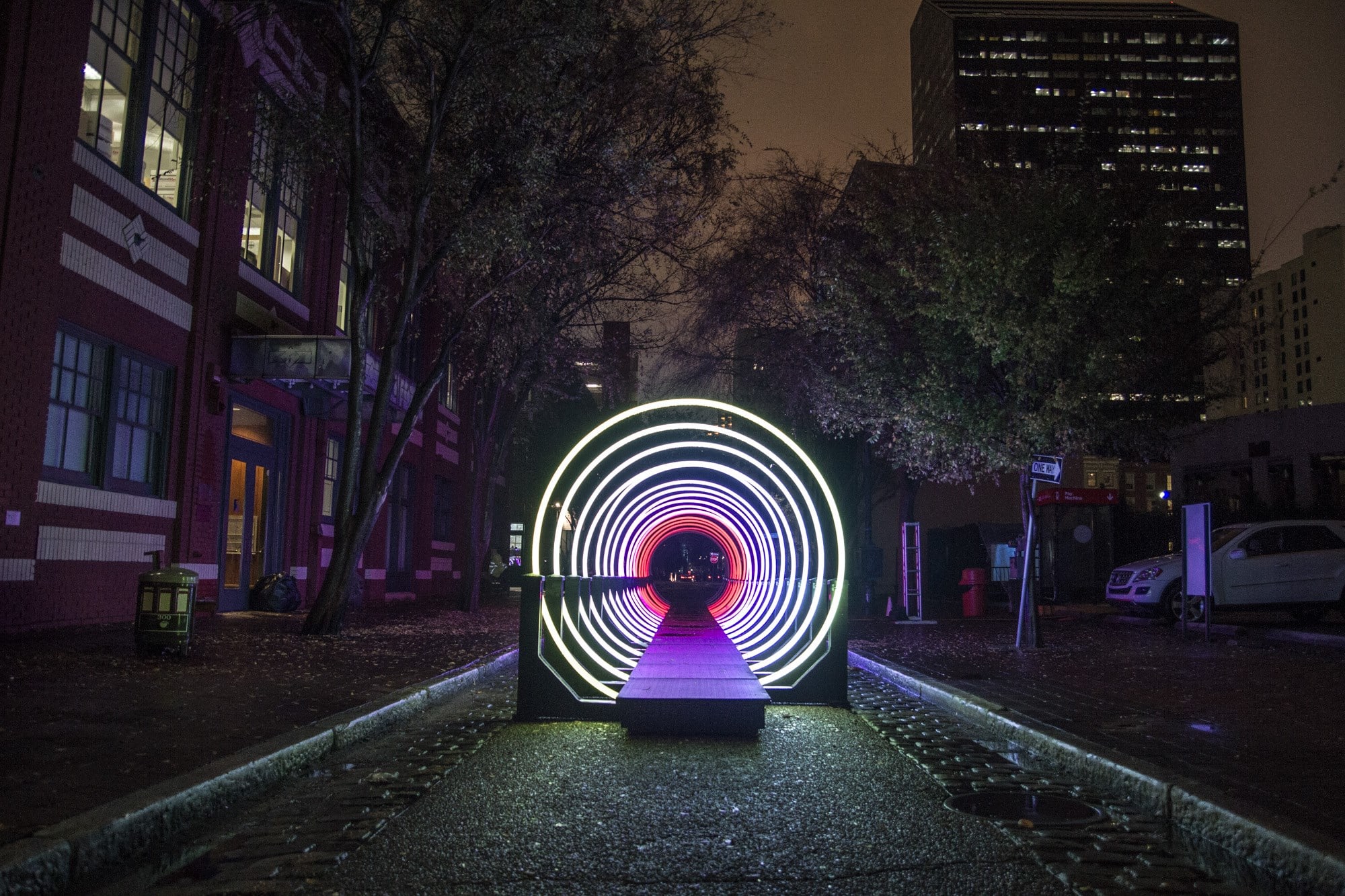 The installation consists of 20 circles of light that form a tunnel which bystanders will go through, and a sound system. The passage through the tunnel activates light animations and sounds. Each configuration has its own ambiance.