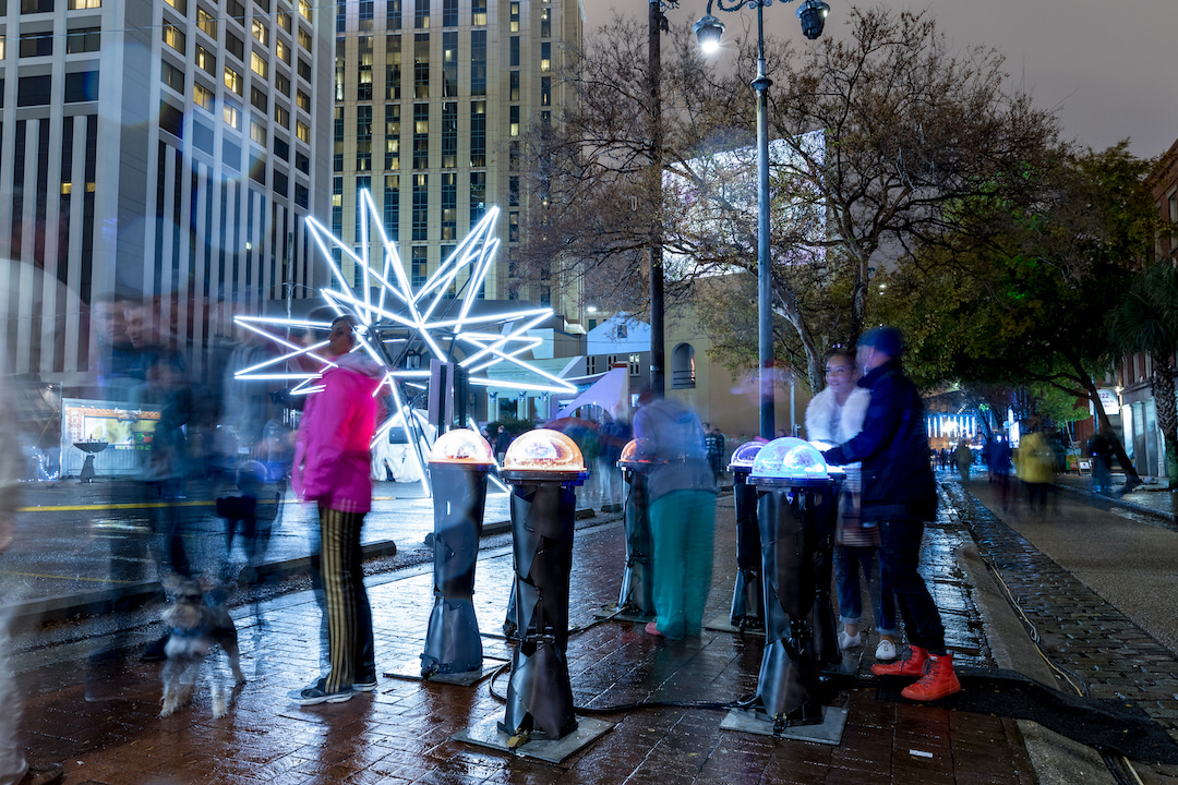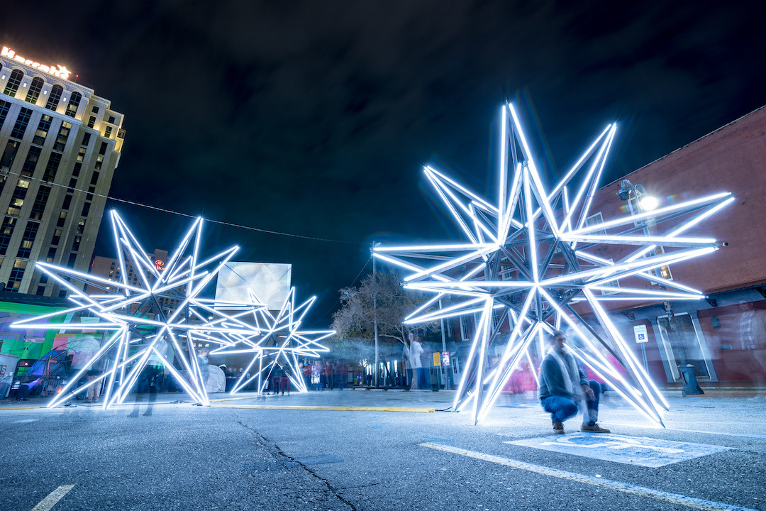 Fallen Stars is an interactive icosahedron multi-star installation. The edges of the star sculpture will pulse and glow throughout the evening. A single, high-powered beam of light will trace the path of the stars fall deep into the night sky. Dancing Grounds dancers will perform at intervals throughout the festival activating the star lights.
