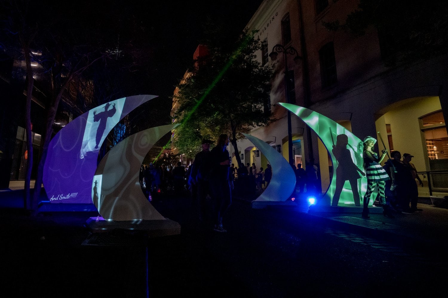 An illuminated and interactive corridor that brings whimsy and joy to those of all ages. Life-size crescents shapes contain projections of LUNA Five Collective animated performances and puppet silhouettes which provide a dynamic and relatable greeting while reacting to the crowd around them.
