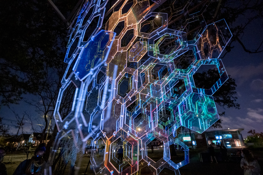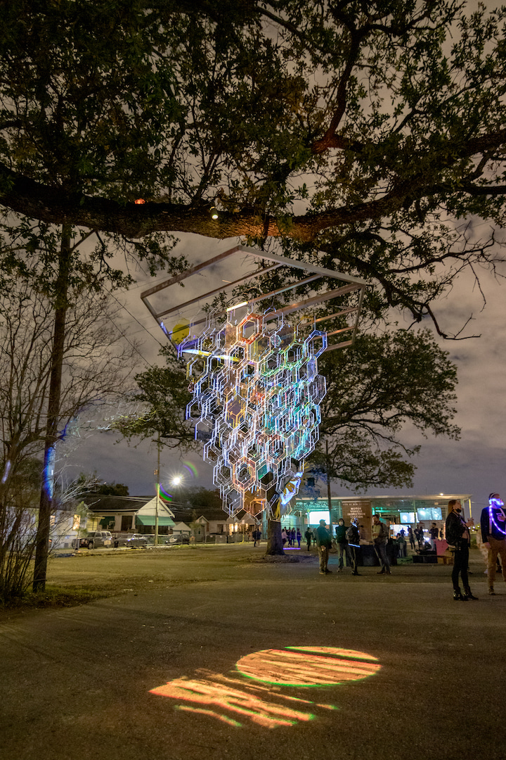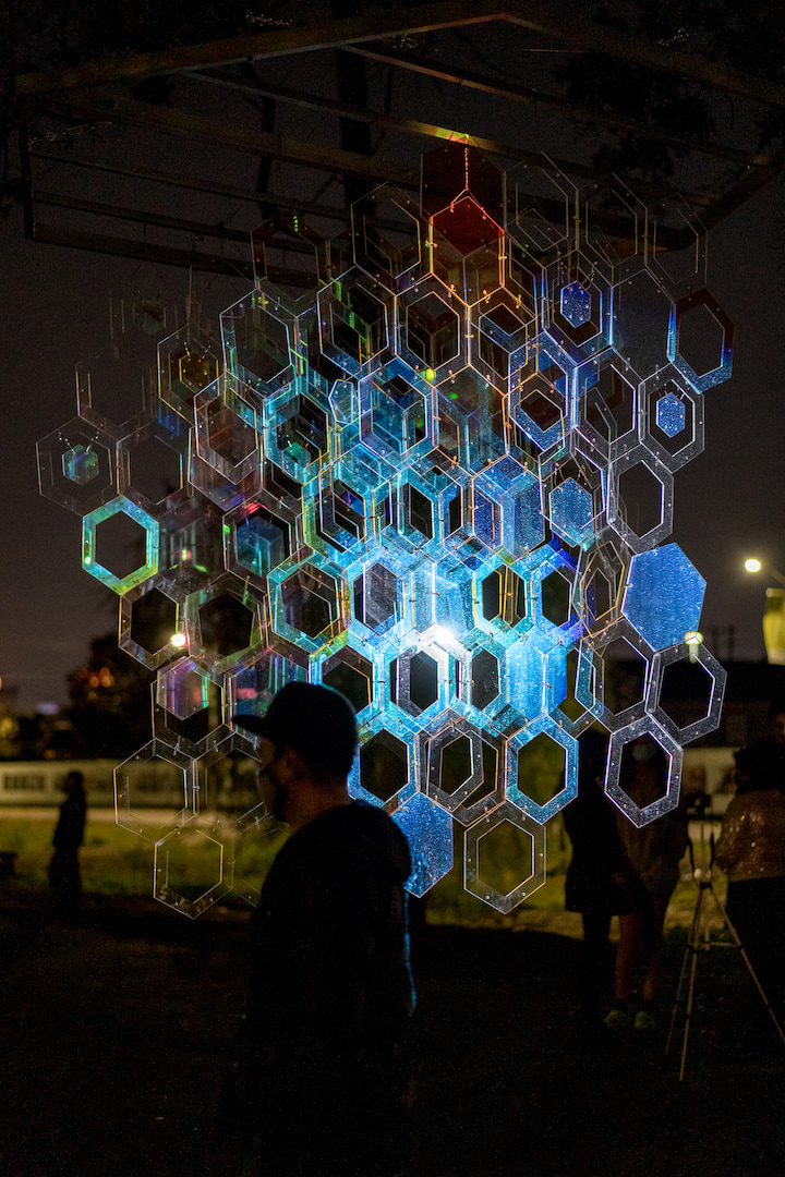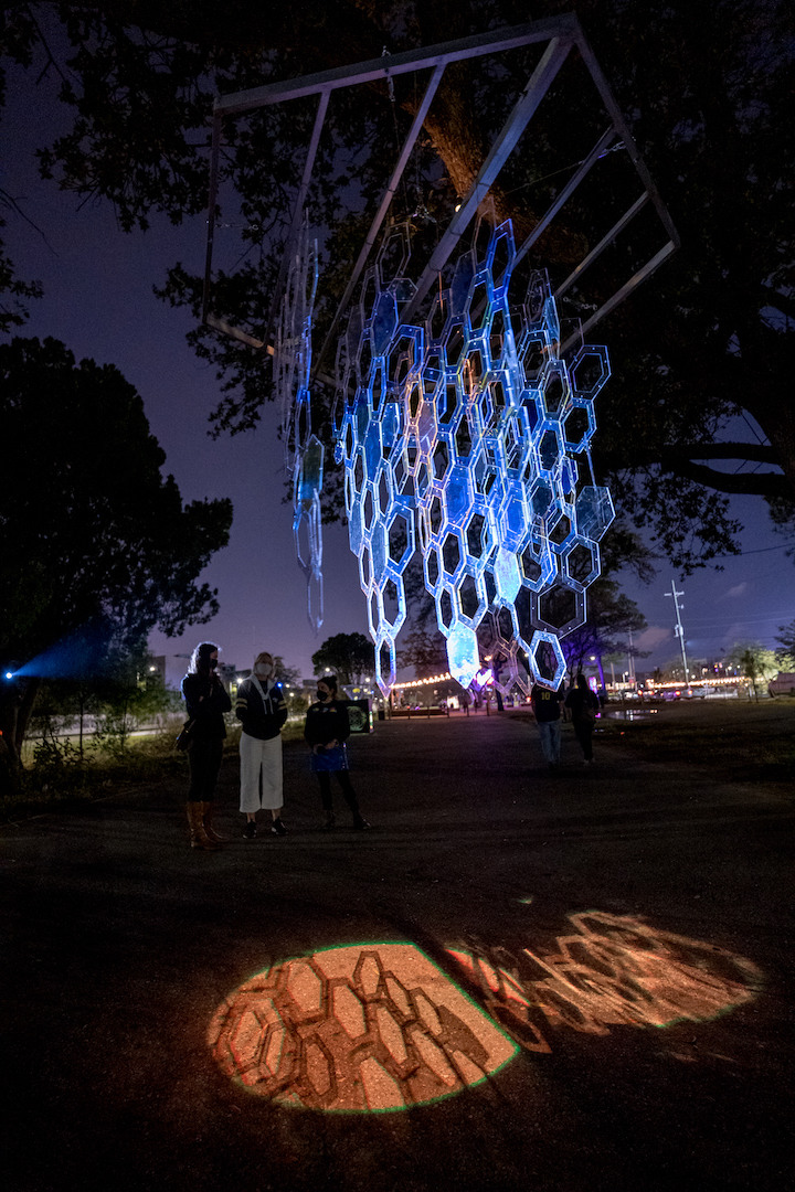 "Alveare Luminoso (Glowing Hive)" is a SUPER HIVE-like structure suspended from an oak tree that activates the tree canopy and surrounding area through light and movement. The piece consists of several vertical layers of hexagons draped from a rigid frame and bathed with amber lights to create rich color and ambience.