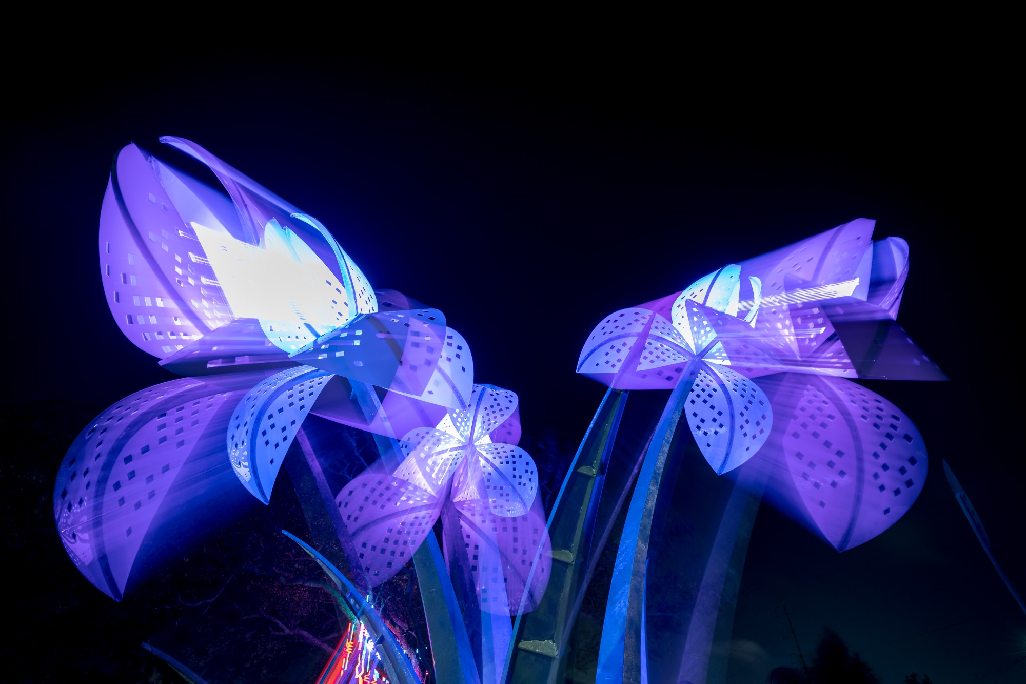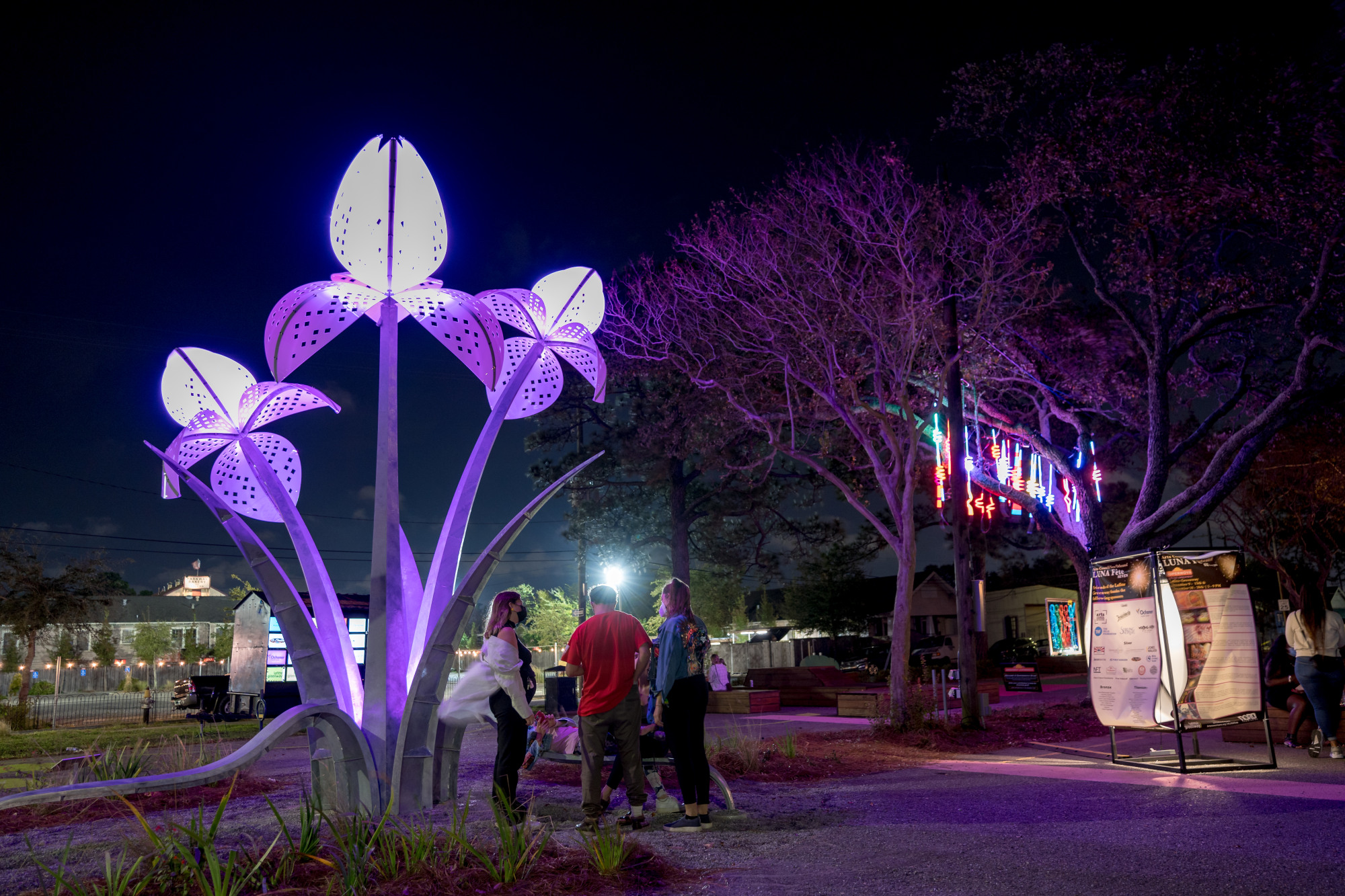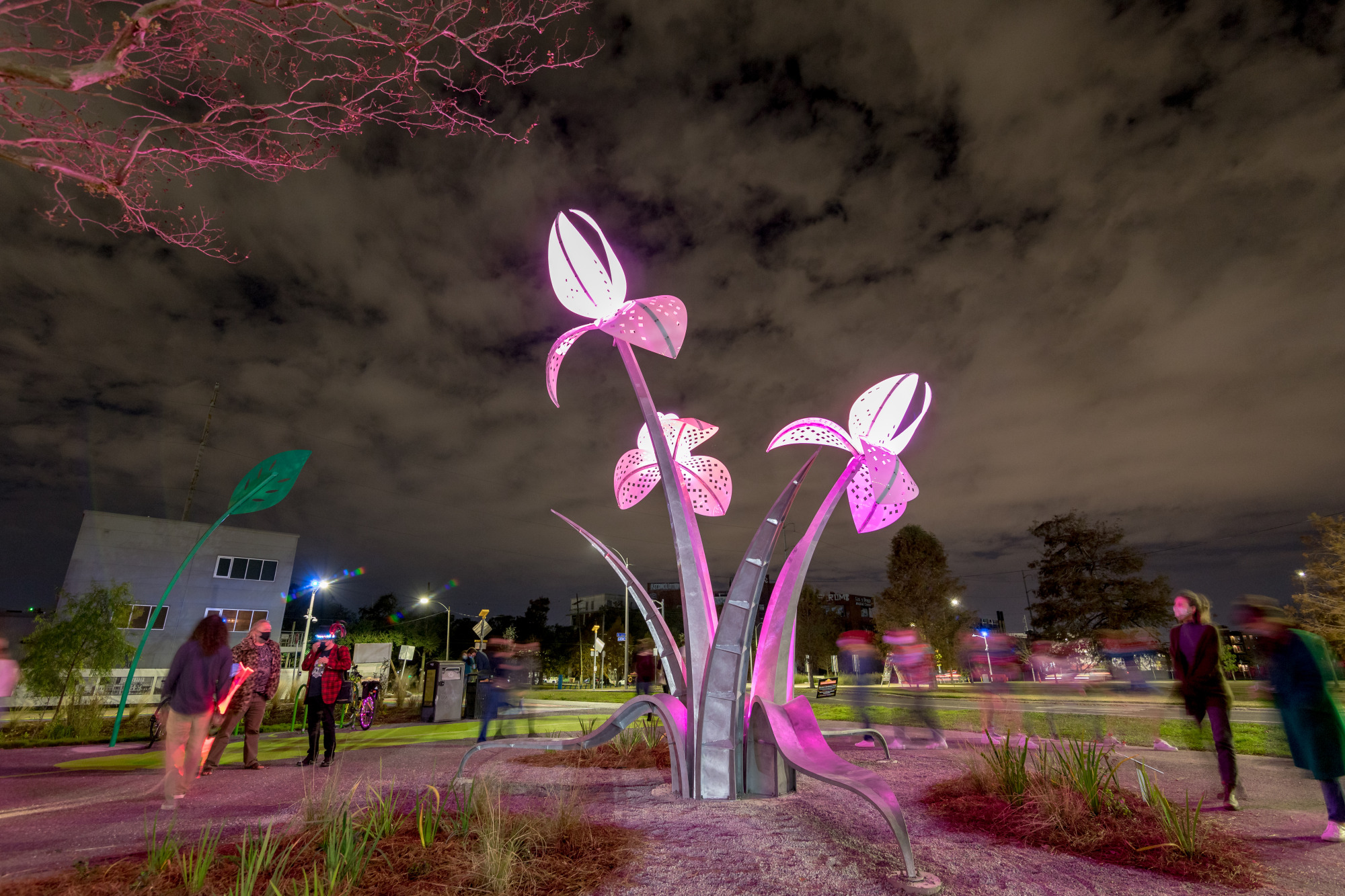 The glowing bouquet embodies our urban greenspace and the need to protect our local and global environment. The flower is inspired by the Louisiana Iris, which is native to the coastal wetlands and planted nearby in the Greenway bioswales.