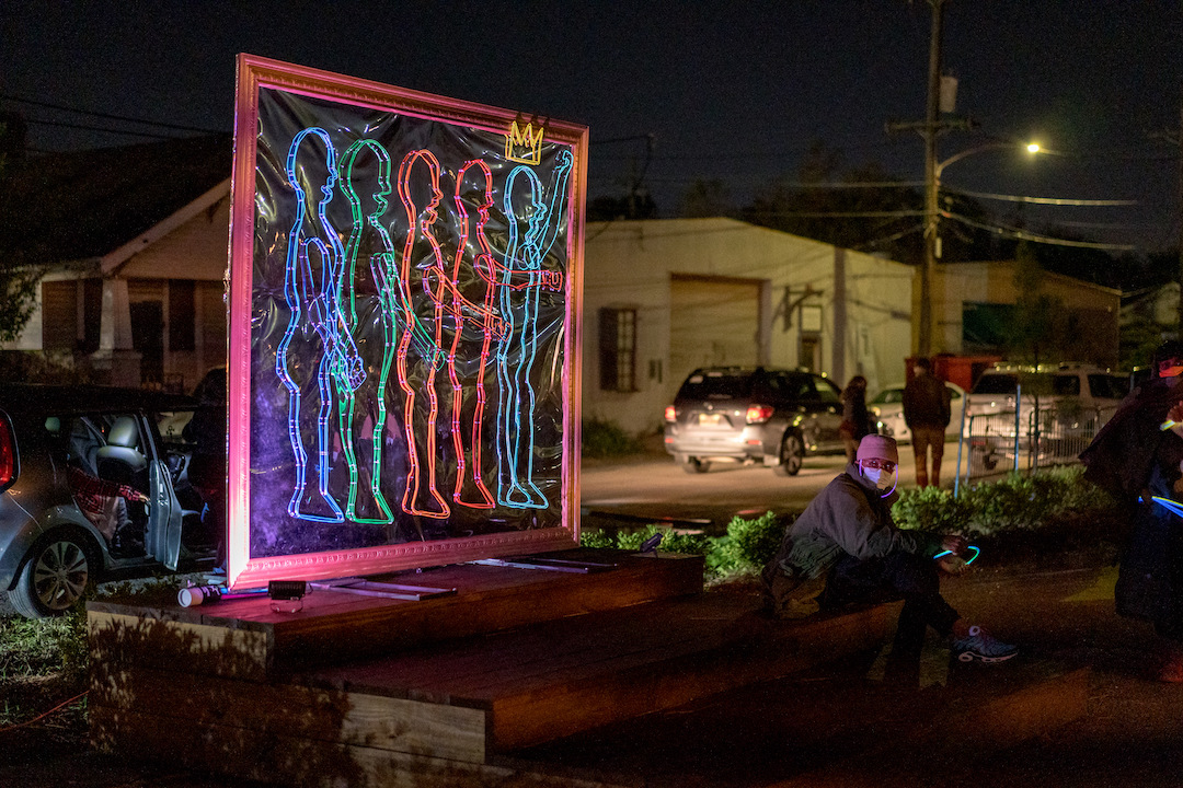 Inspired by coming together to create change, inspire hope, and honor the city we love. Human bodies formed by LED lights create a flow of motion with a fist or flower in hand progressively moving from hip to upright position. This innovatively shows how New Orleanians come together to create change we seek.
