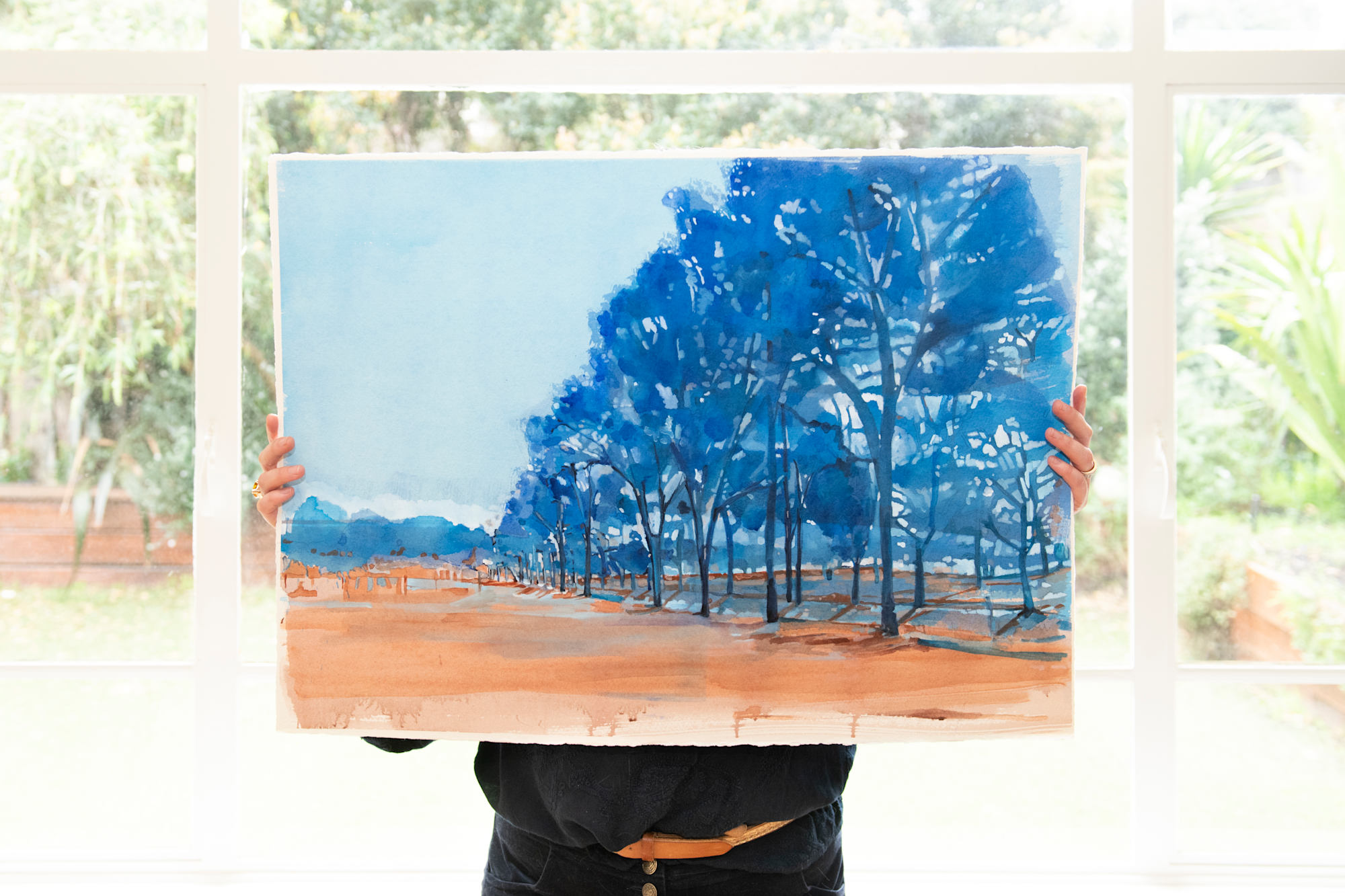 This work was created during a walk through Mitchelton Winery in Nagambie. The long row of trees caught my attention—their strong vertical forms and deep blue tones standing out against the open sky and warm earth. I wanted to capture the simplicity and structure of the scene, the way the trees framed the landscape and led the eye into the distance. The painting reflects the calm and clarity of that moment, where the geometry of nature and the quiet rhythm of the land felt balanced and beautiful.