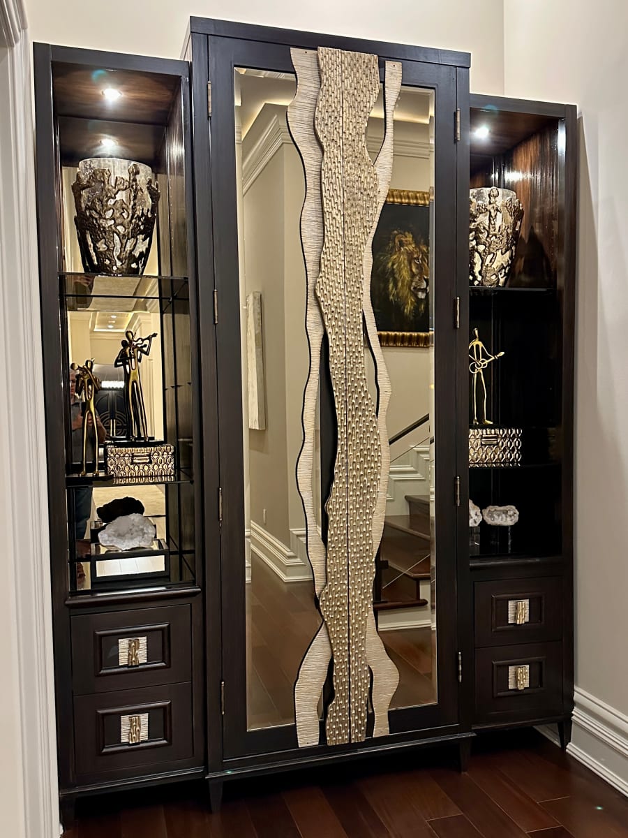 Custom Cabinet Pulls created from customer’s inspiration. Cut from 1/4” and 1/2” aluminum, textured freely by hand using power tools and faux finished in layers of gold and silver.