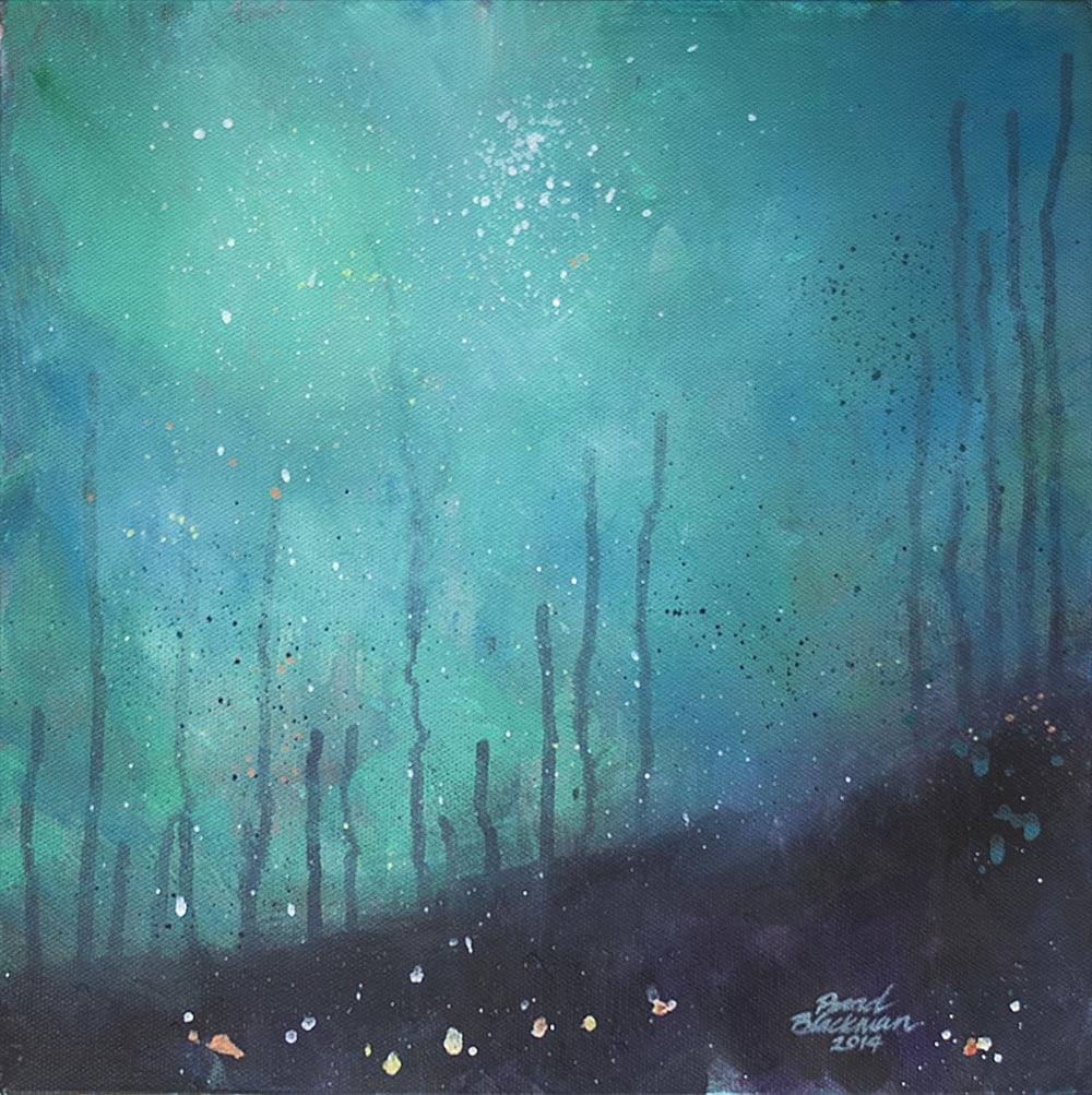 This is a piece that began life as something else entirely. I dripped colors on the canvas that were complimentary to the greens and purples present in the overall piece, and it evolved into something that evokes a sense of being underwater. It was created during Art Every Day Month 2014, on days fifteen, sixteen, seventeen, eighteen, and twenty.
