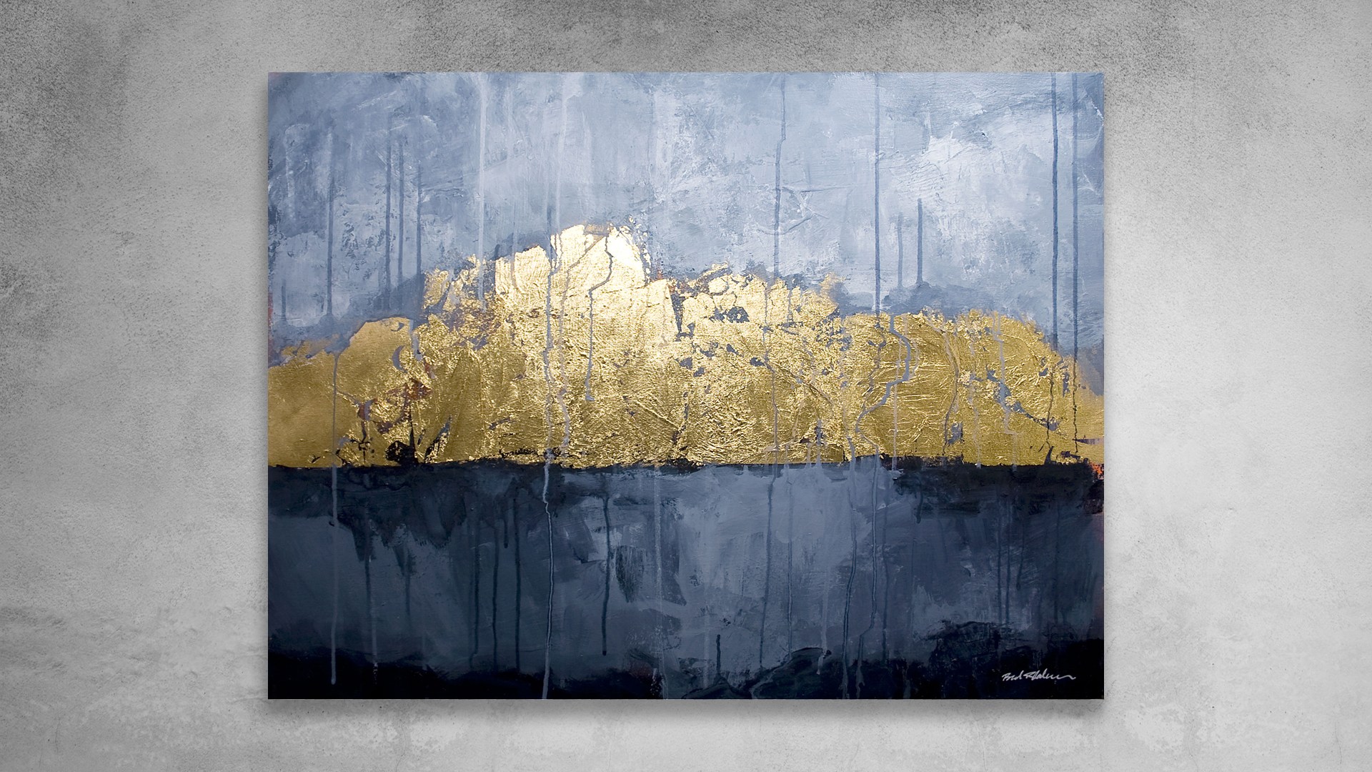 The office is a neutral gray, so I decided to work with more gray colors and add a pop of metallic gold by using gold leaf. This was my first time using gold leaf. It’s tricky to use! You have to hold your breath so it doesn’t blow away. It’s very delicate.