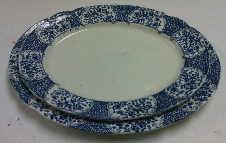 - Subject Matter: 2 Matching set of blue and white transfer platters around edge
