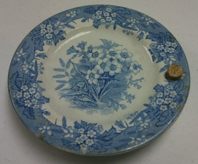 - Subject Matter: Hollow blue and white food plate with flower pattern, Bouquet, around perimeter and center with cork in hot water filing hole William Brownfield & Sons
