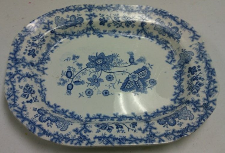 - Subject Matter: Medium platter with blue and white transfer with a flower design with matching center