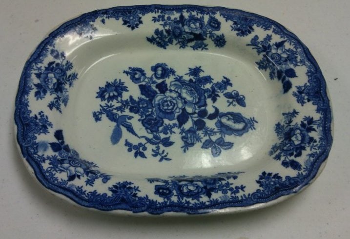 - Subject Matter: Medium platter with blue and white transfer with floral pattern on perimeter, and in center with bird in flight