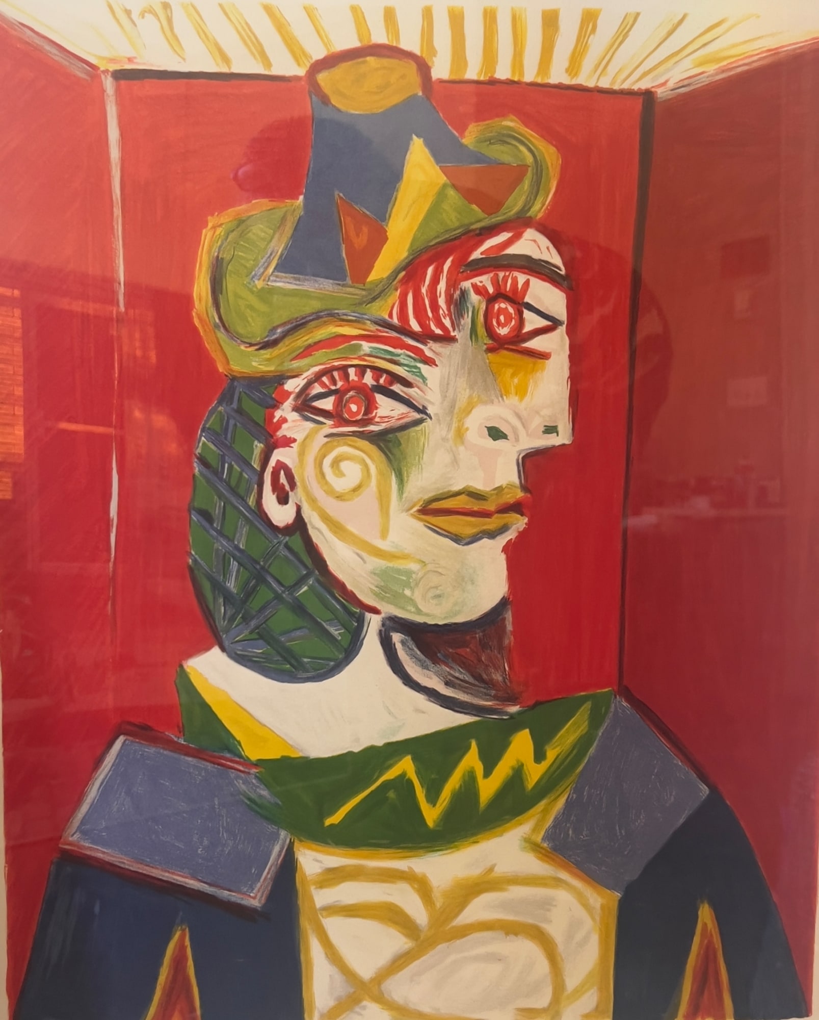 Created during his Blue Period, Pablo Picasso’s portrait of a woman staring downward while cloaked in a shawl with patches on it is emblematic of his work during this time.