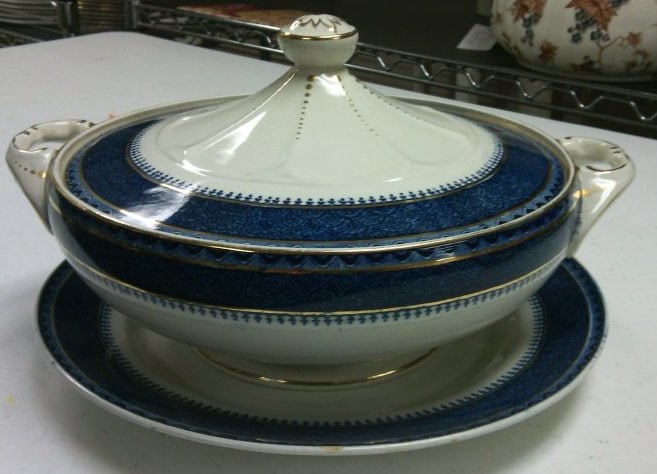 - Subject Matter: Blue and white covered serving dish with saucer and lid by Leighton Pottery, Rio pattern