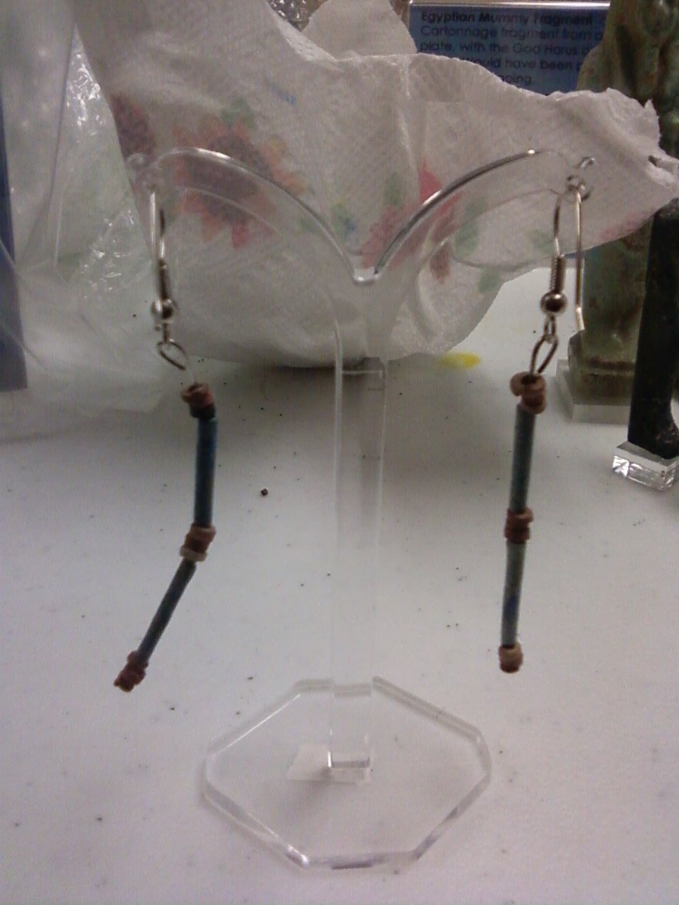 - Subject Matter: Egyptian long terracotta mummy beads restrung on modern earring setting