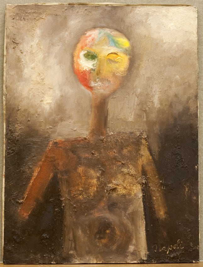 • Subject Matter: 2373 Figure with swollen belly and multiple colored face and eye sockets.