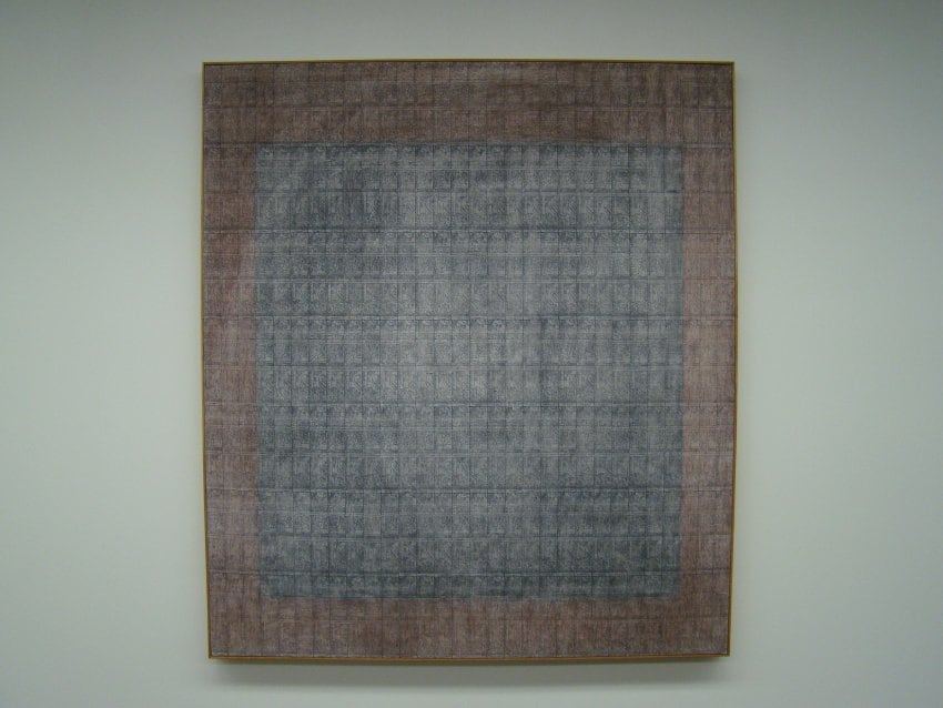 - Subject Matter: Dillon stencil acrylic on canvas grey square in center with pink border 1975 Andy Warhol Photographic Legacy Donation