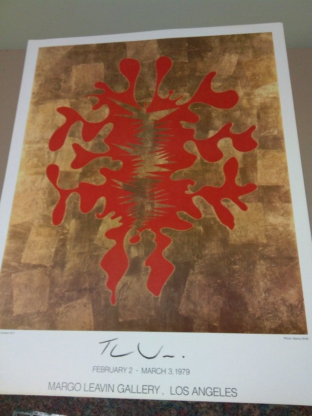 • Subject Matter: Poster with brown background and red organic form. set of 2 - 2/2. Margo Leavin Gallery Tom Wudl