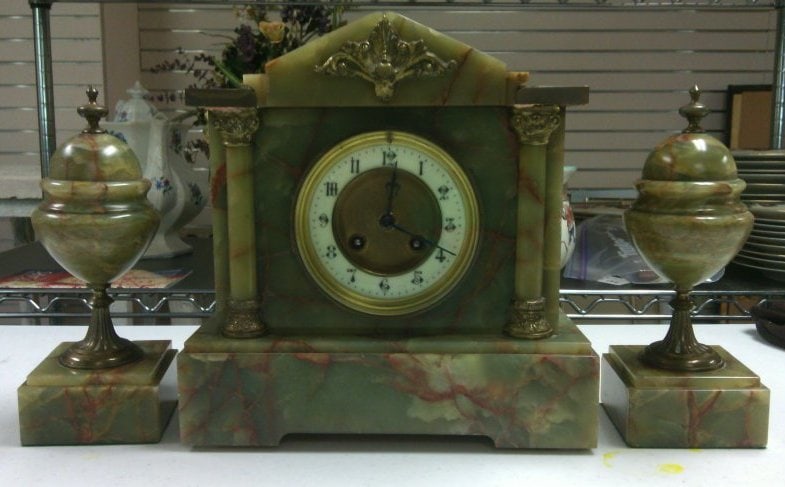- Subject Matter: Green onyx clock with 2 matching sconces