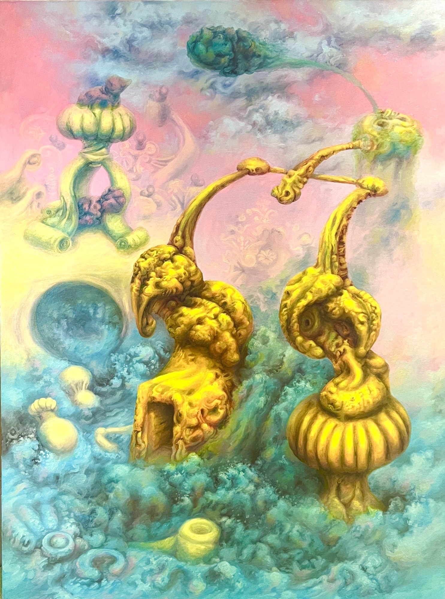 - Subject Matter: Surrealistic landscape with fantasy and imaginary figures, yellow blue-greens and pinks