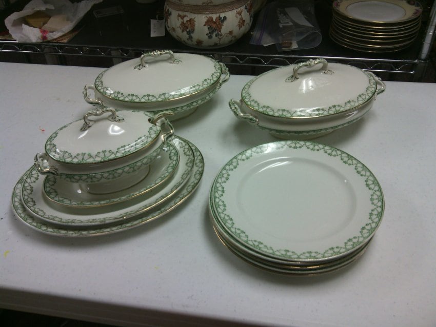 - Subject Matter: Victorian semi-porcelain table service, 15 pieces total, 2 covered serving dishes, 1 covered sauce boat with ladle, 1 large platter, 1 medium platter, 1 small platter, 5 plates, Green Realia pattern, Alfred B. Rearce & Co.