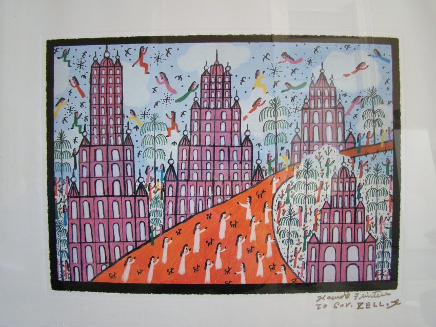 • Subject Matter: Finster, Stairway Stairway to Heaven colorful: pink city, orange road, angels throughout written messages throughout poster print proof #721 signed to Gov. Zell Miller. Howard Finster was a preacher for 45 years until one day in 1976, he saw a vi...