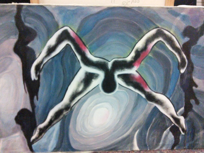 - Subject Matter: Distorted figure with stretched arms and legs against abstracted background Slight wear where canvas attaches to frame