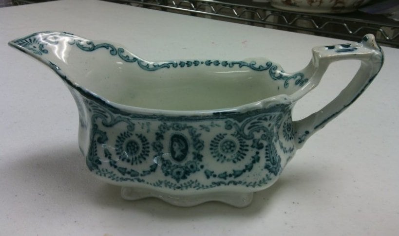 - Subject Matter: Teal and White Gravy Boat, fancy, Staffordshire