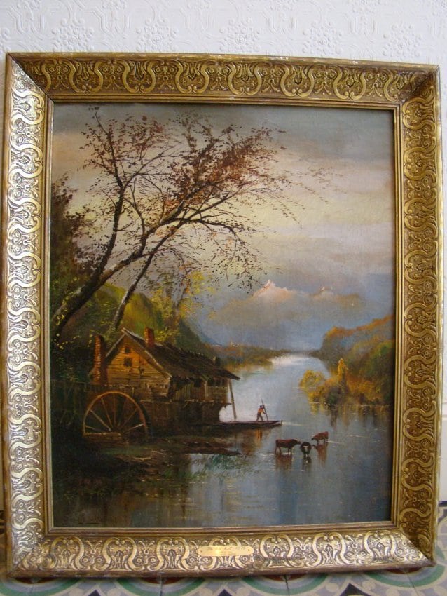 • Subject Matter: Hill The Old Mill Large water wheel turning water in river dark colors artist is 19th century american
