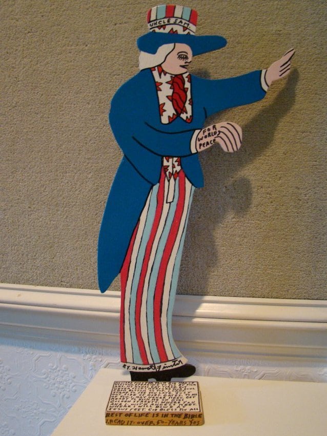 • Subject Matter: Finster, Uncle Sam Uncle Sam wood cutout pointing to left paint/marker on wood cut out w/ base writing on base and reverse Howard Finster was a preacher for 45 years until one day in 1976, he saw a vision of a face in the fingerprints on his thum...