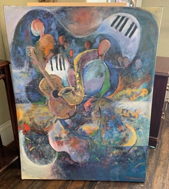 • Subject Matter: Abstract painting of musical instruments on canvas