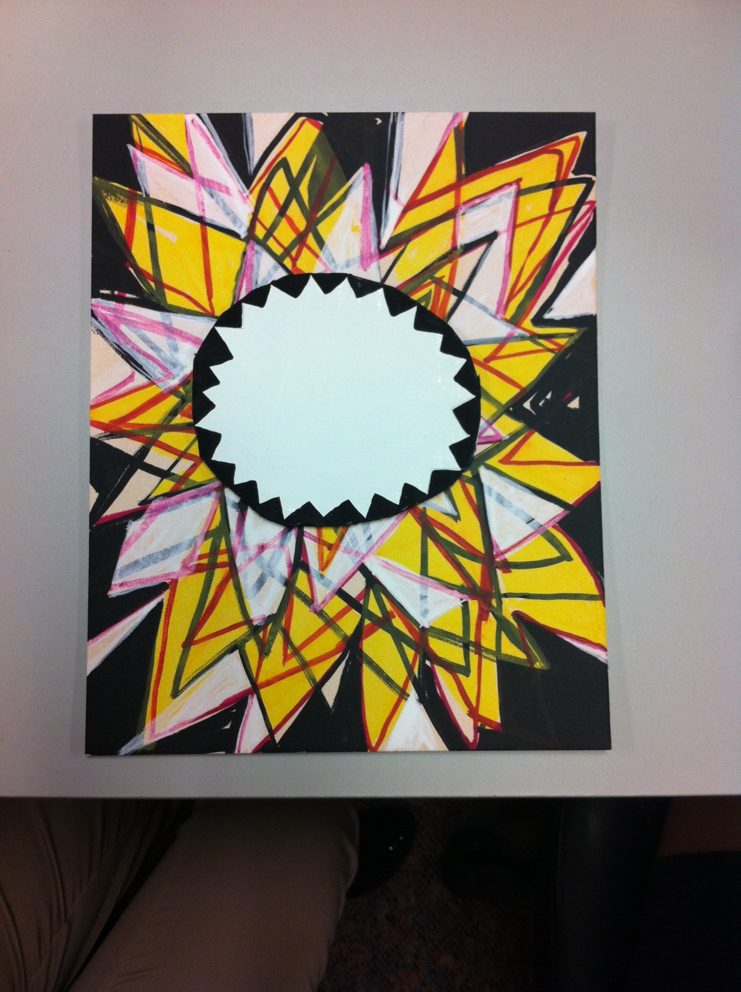 - Subject Matter: Mixed Media work witth raised cardboard circle attached to surface. Reds, pinks, yellows, black and white triangular shapes eminating from central circle. Exhibition label: Santa Monica Museum of Art "Incognito" exhibit May 11,2013