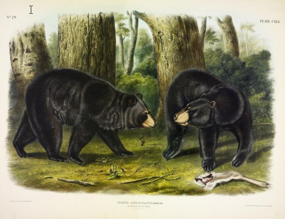 Ursus Americanus, Pallas. American Black Bear. (v. 3, no. 29, plate 141), 1848 Painted by John Woodhouse Audubon (1812–1862) with background likely by Victor Gifford Audubon (1809-1860) Lithographed by J. T. Bowen &. Co., Philadelphia, PA Lithograph with
