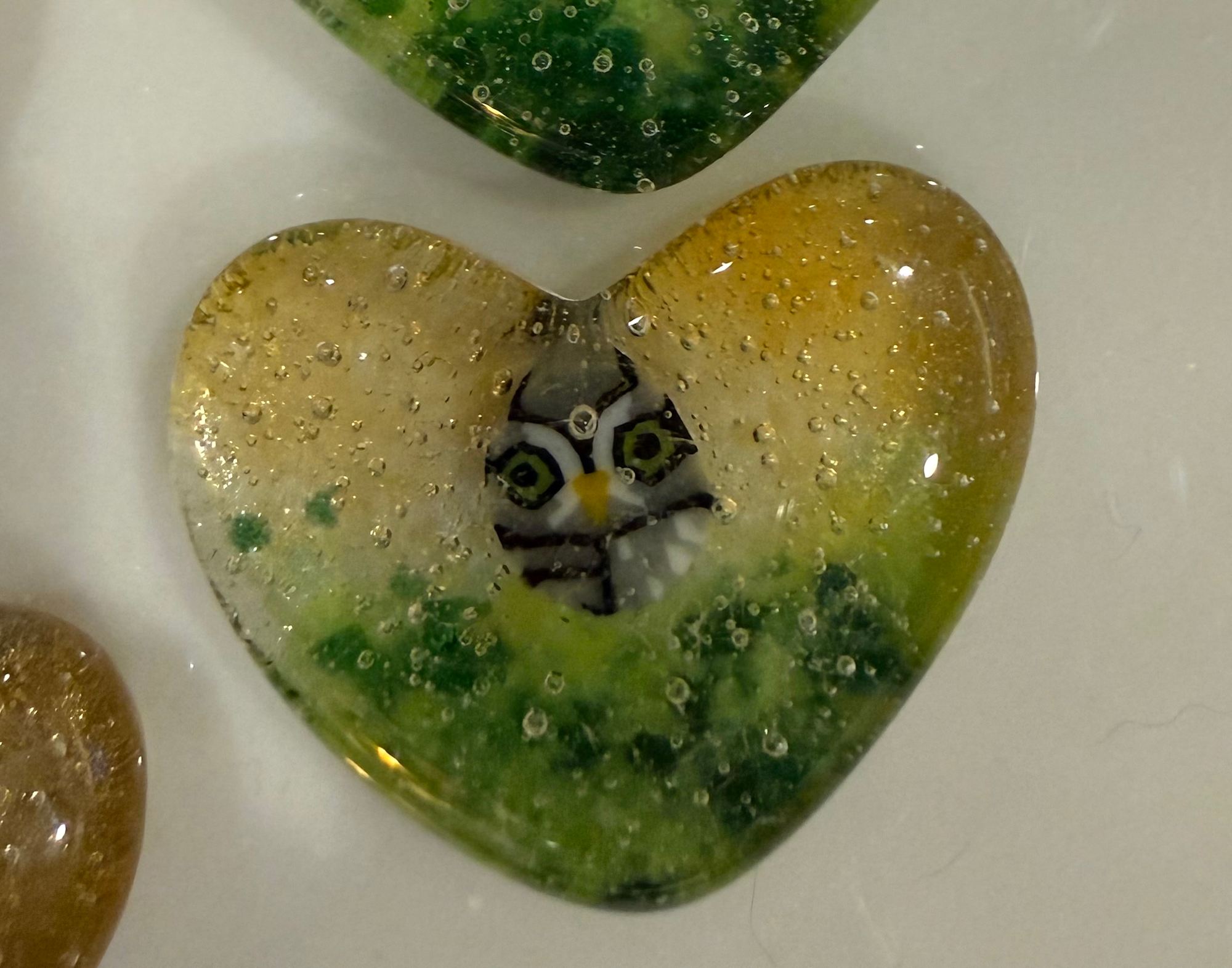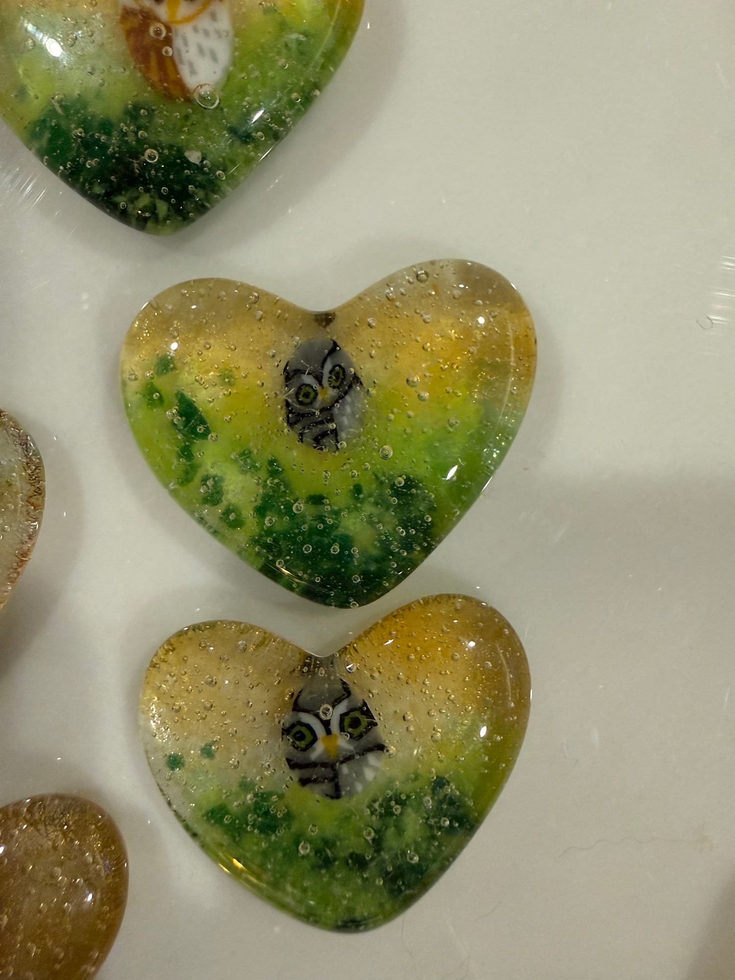 These hearts are created from pieces of clear and colored glass in a ceramic heart mold then fired in a kiln for 23 hours at high temperatures on a Full Fuse schedule. Some have tiny glass murinni pieces such as ladybugs, flowers, or owls included. Some hearts are put back in the kiln and run through a Fire Polish schedule to make the back shiny and smoother.