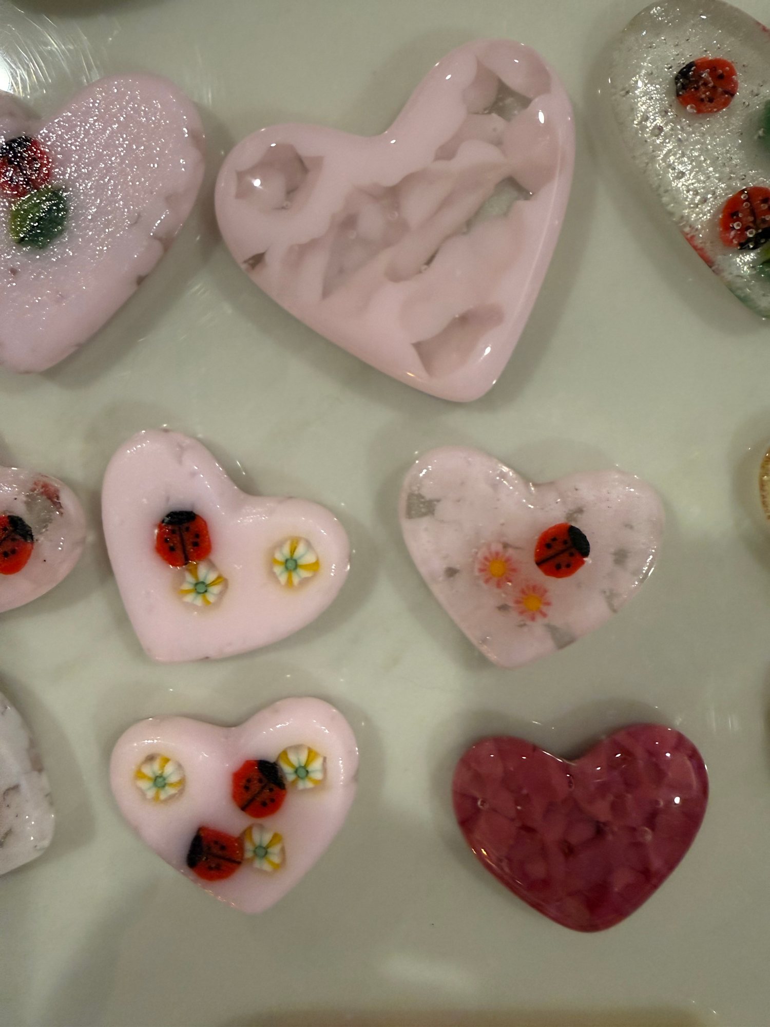 These hearts are created from pieces of clear and colored glass in a ceramic heart mold then fired in a kiln for 23 hours at high temperatures on a Full Fuse schedule. Some have tiny glass murinni pieces such as ladybugs, flowers, or owls included. Some hearts are put back in the kiln and run through a Fire Polish schedule to make the back shiny and smoother.