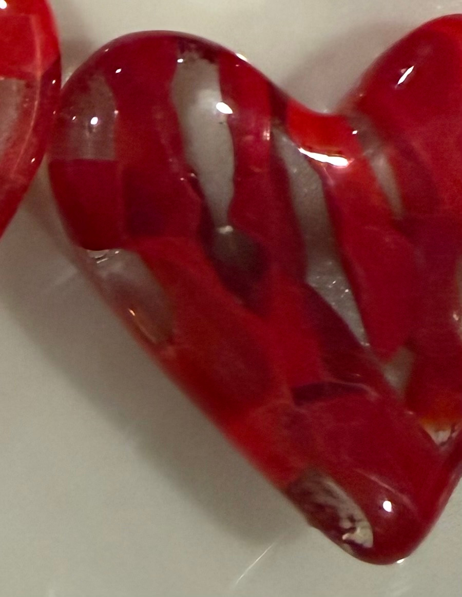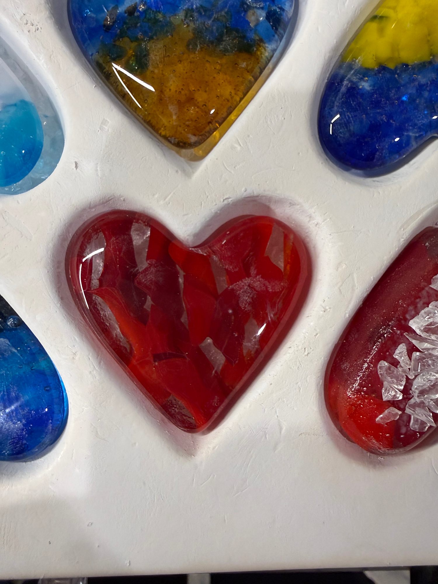These hearts are created from pieces of clear and colored glass in a ceramic heart mold then fired in a kiln for 23 hours at high temperatures on a Full Fuse schedule. Some are put back in the kiln and run through a Fire Polish schedule to make the back shiny and smoother.