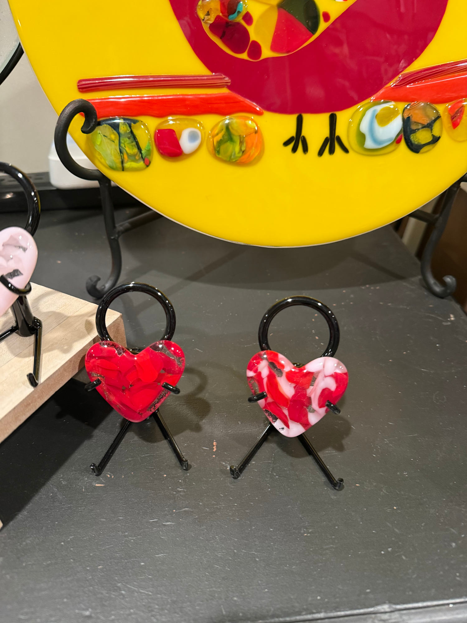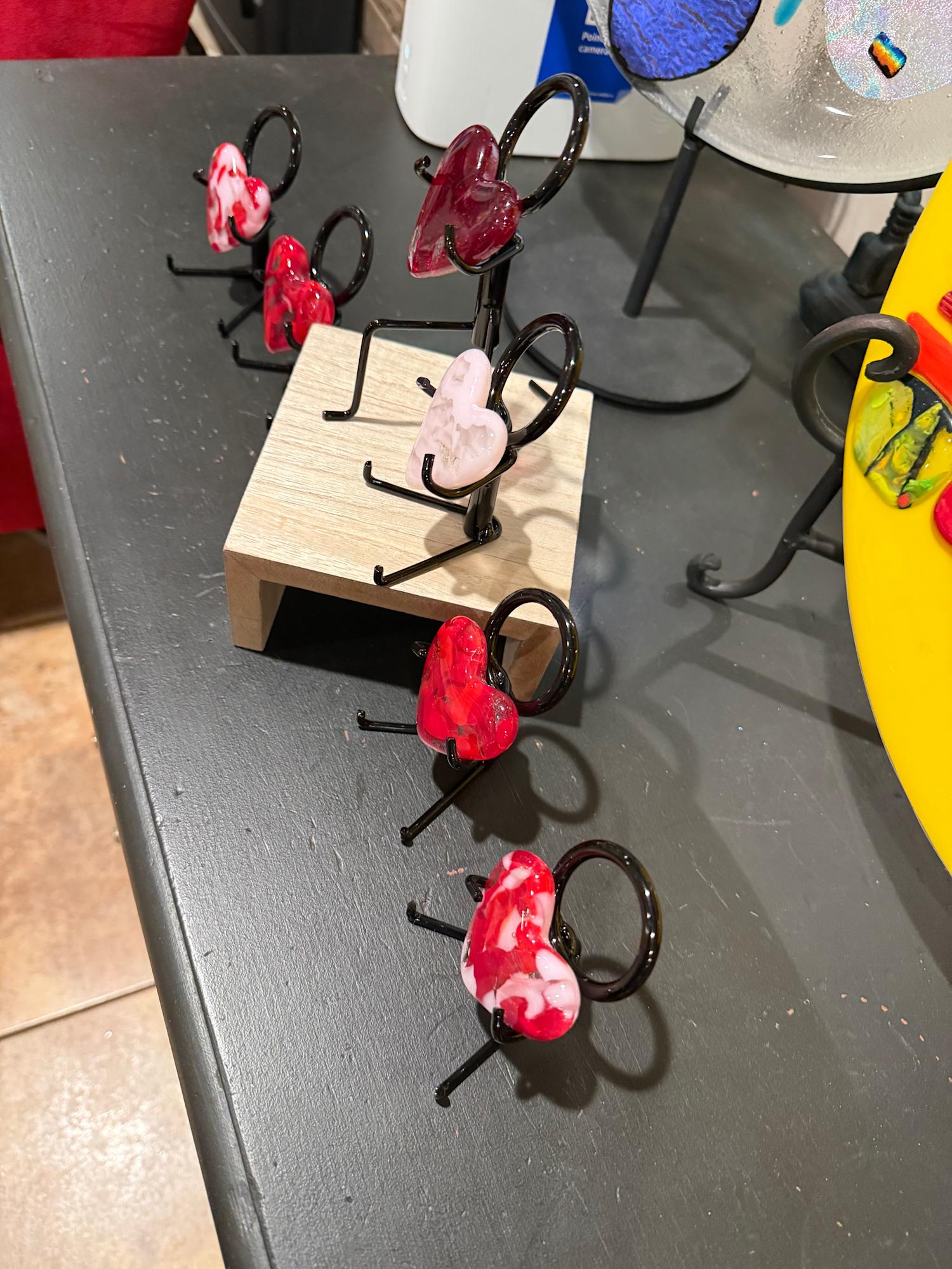 Red, pink, and white chunks of glass cast in a 2” heart mold. Stand not included, but is available on Etsy.