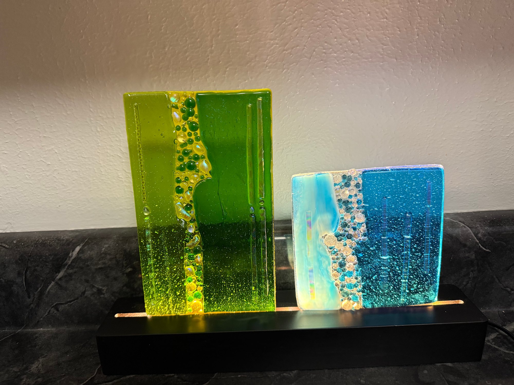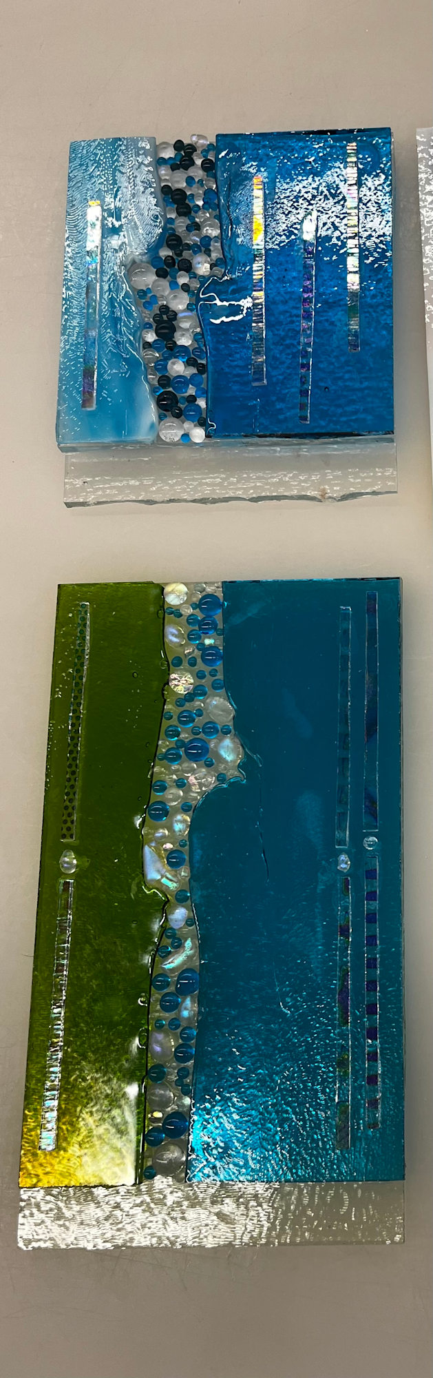 Sheets of fusible glass can have rolled edges. These 2 designs include two colors of rolled edges facing each other, creating a river bank then filled with glass dots.