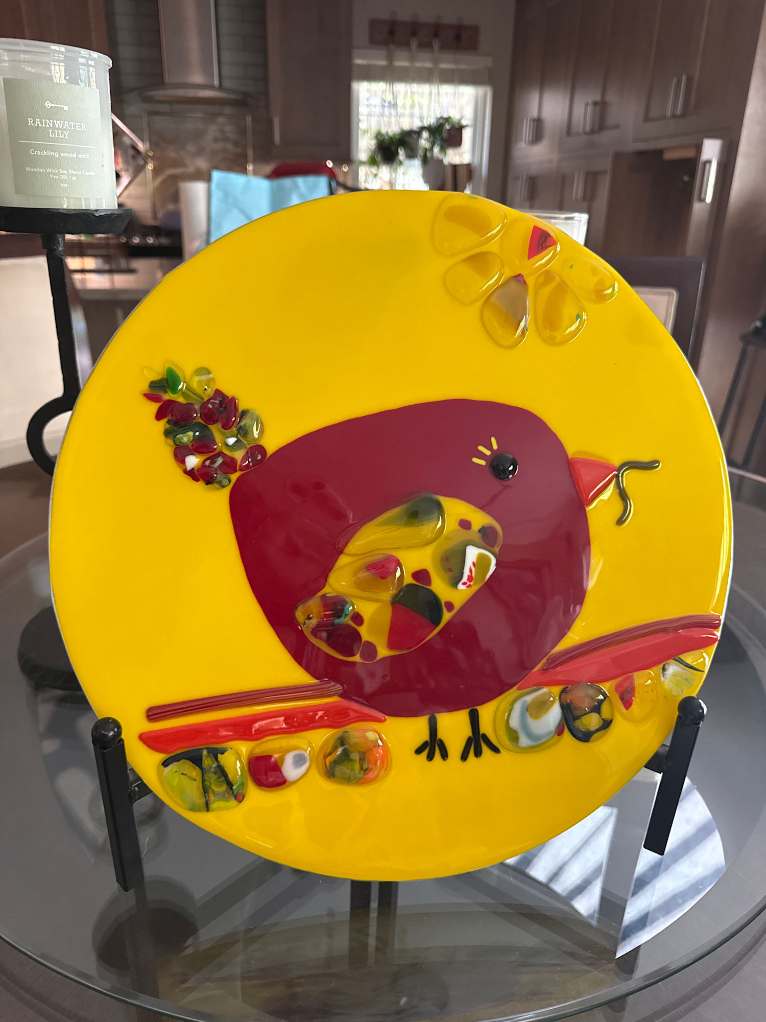 Pebbles are made from chunks of broken glass projects that are fired to melt into unique pebbles. These are fun to add to new projects such as this character bird circle.