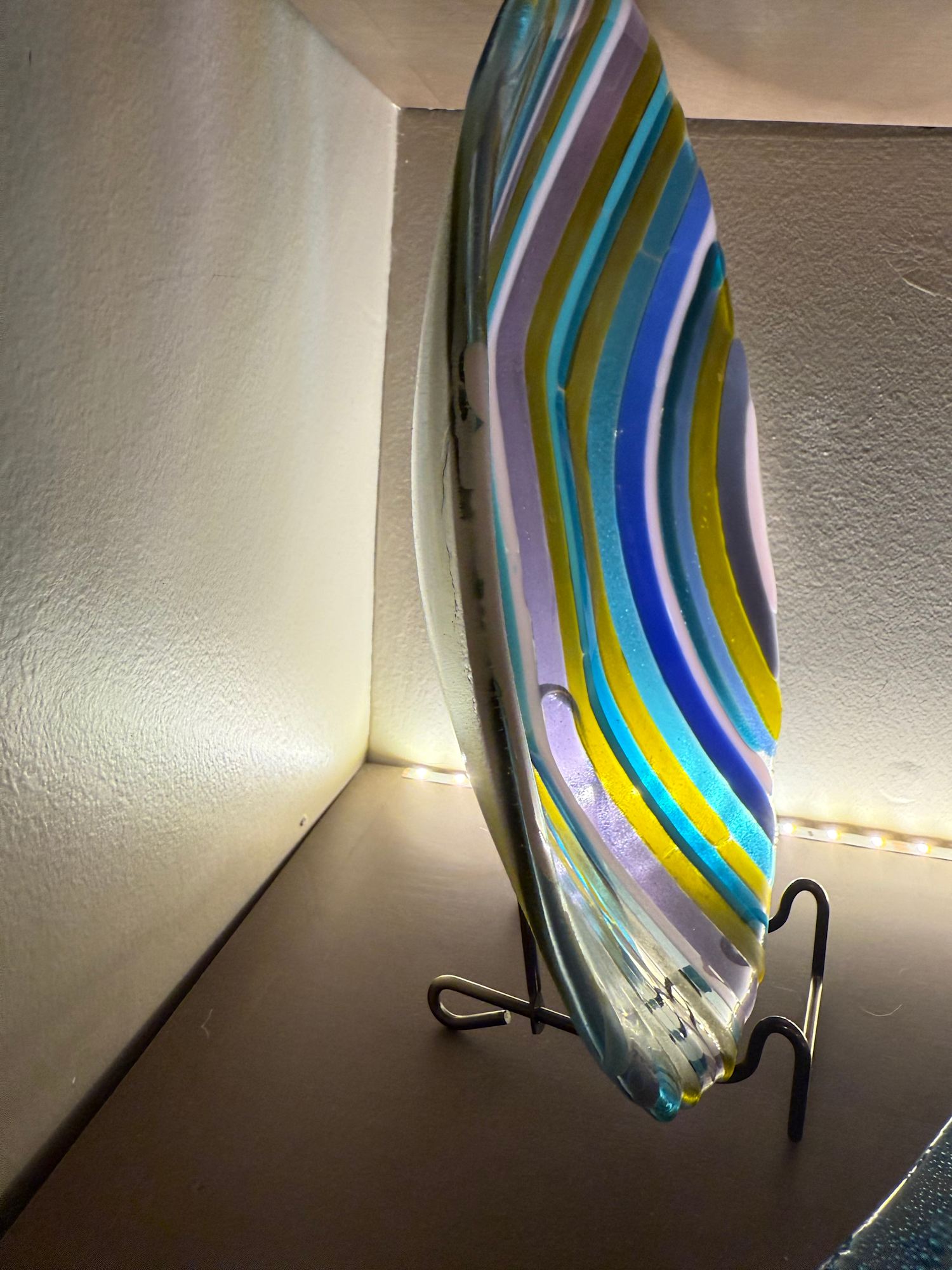 2mm and 1mm transparent color glass stringers are individually glued to a double layer of clear glass, full fused, then slumped in a bowl mold.