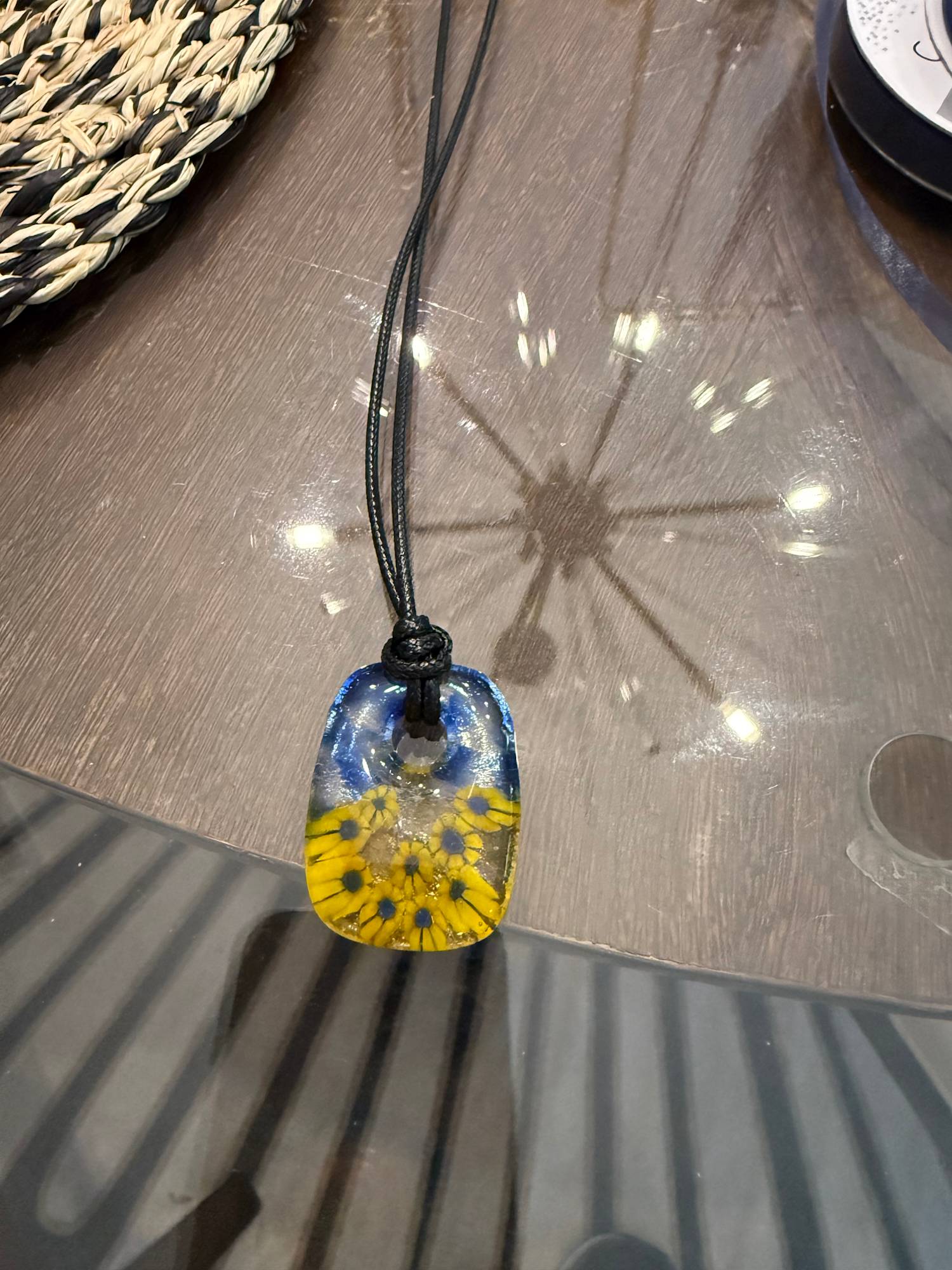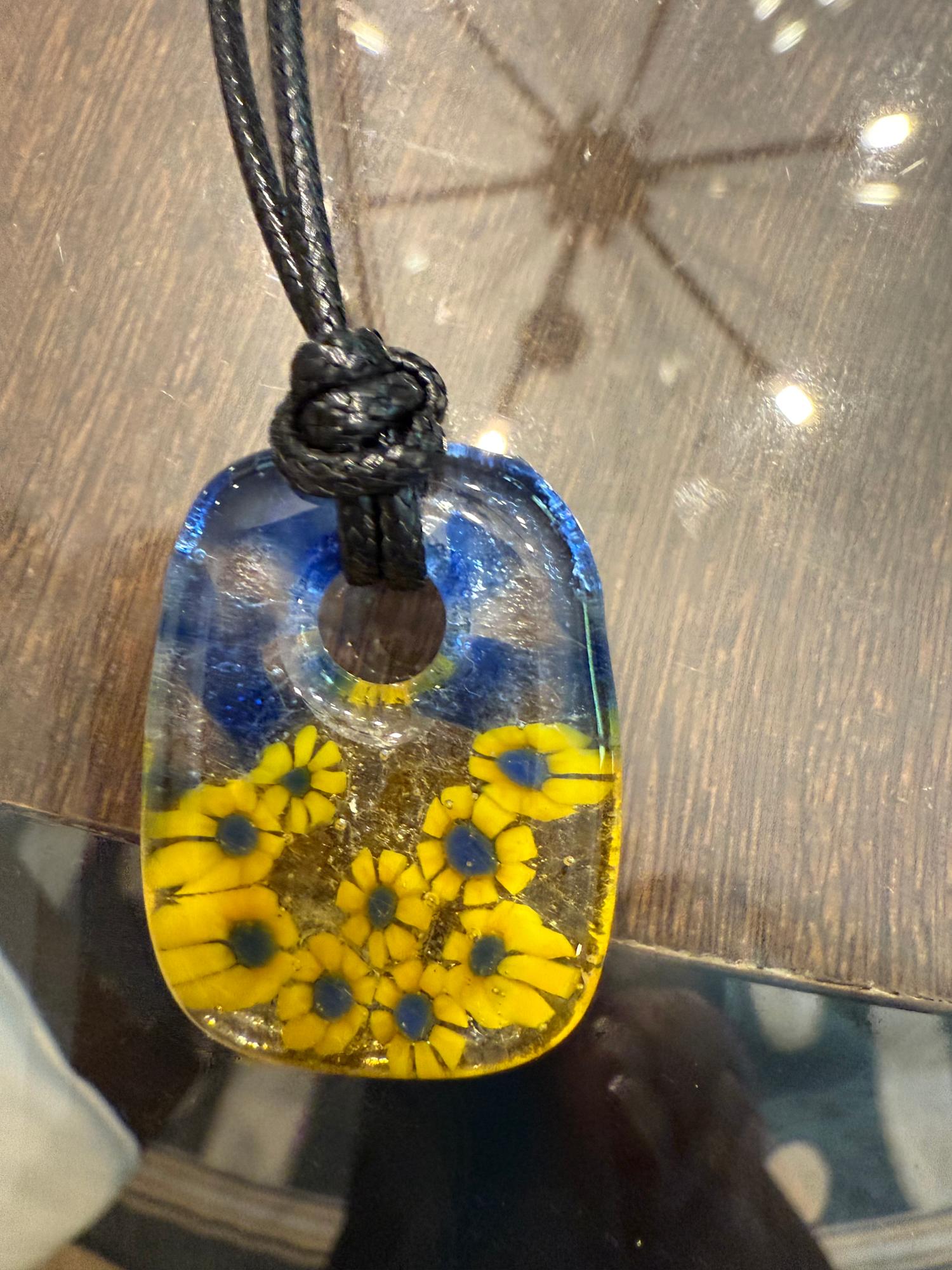 Ukraine colored sunflower pieces are cut from glass cane from an Etsy seller who donates proceeds from the sale of this supply to help the good people of Ukraine