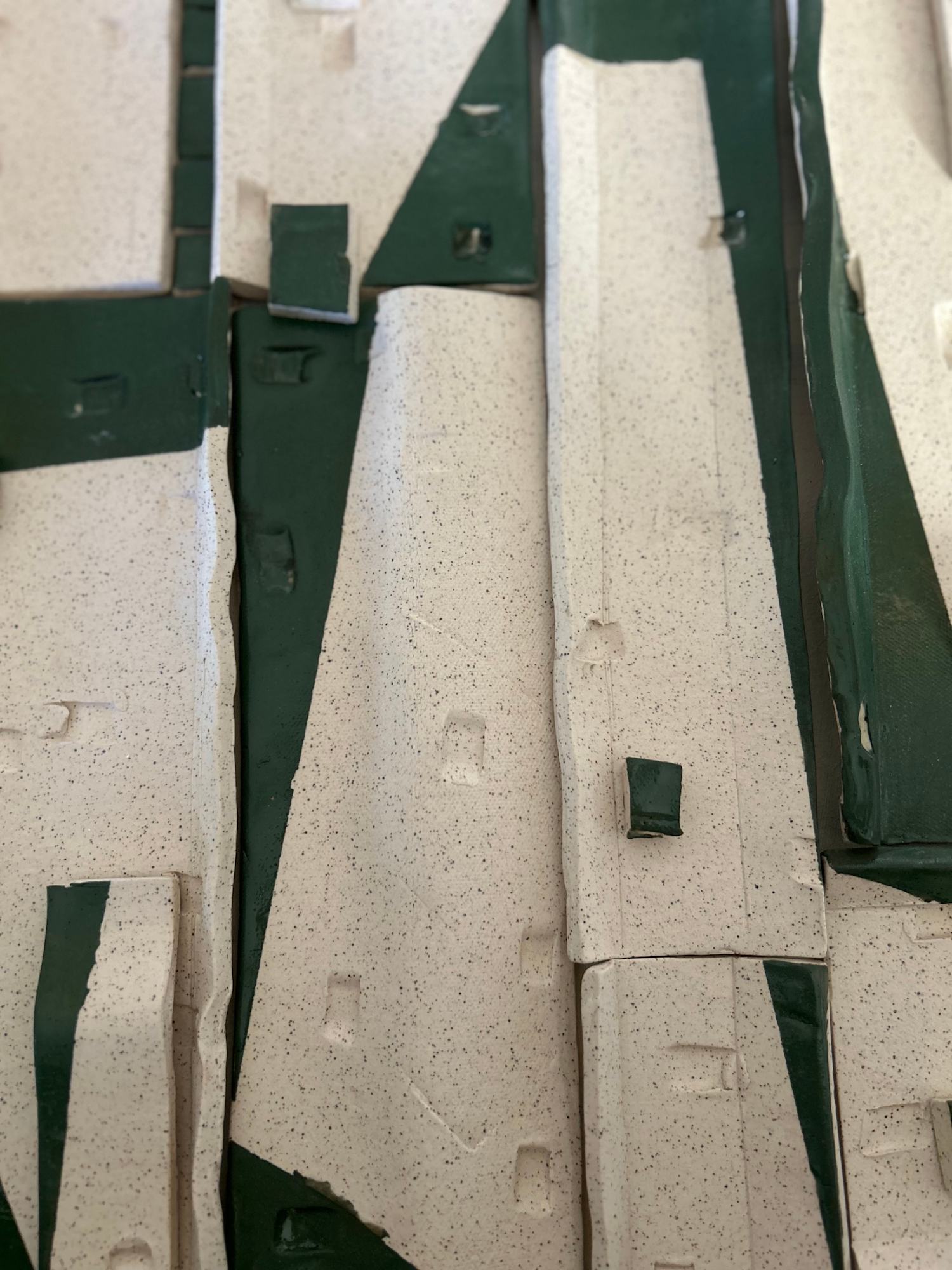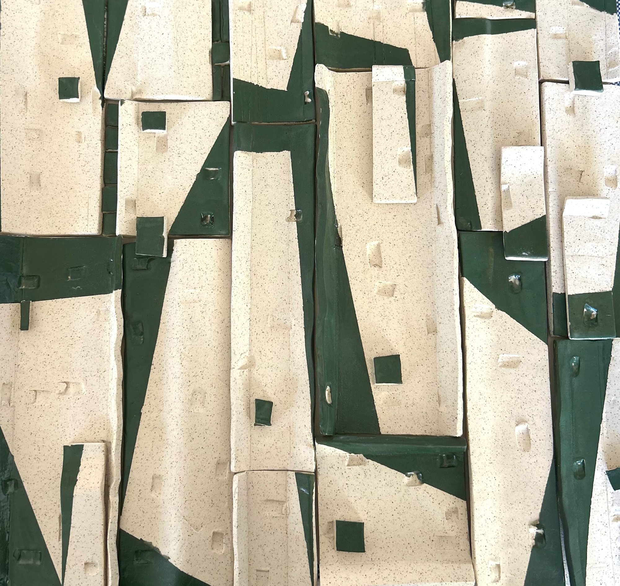 This ceramic wall piece is built through vertical divisions and angled planes that hold tension across the surface. Fields of warm white and olive green interlock, creating pauses and breaks that slow the movement of the eye. The work balances weight and restraint, emphasizing structure, separation, and quiet continuity.