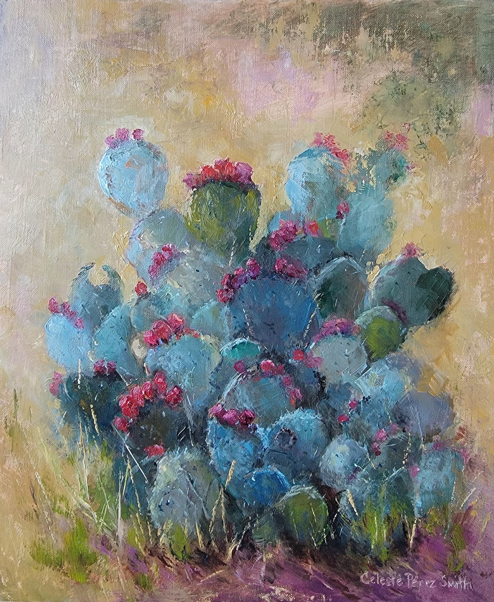 Backlit prickly pear along a path at the Lady Bird Johnson Wildflower Center in Austin, Texas.