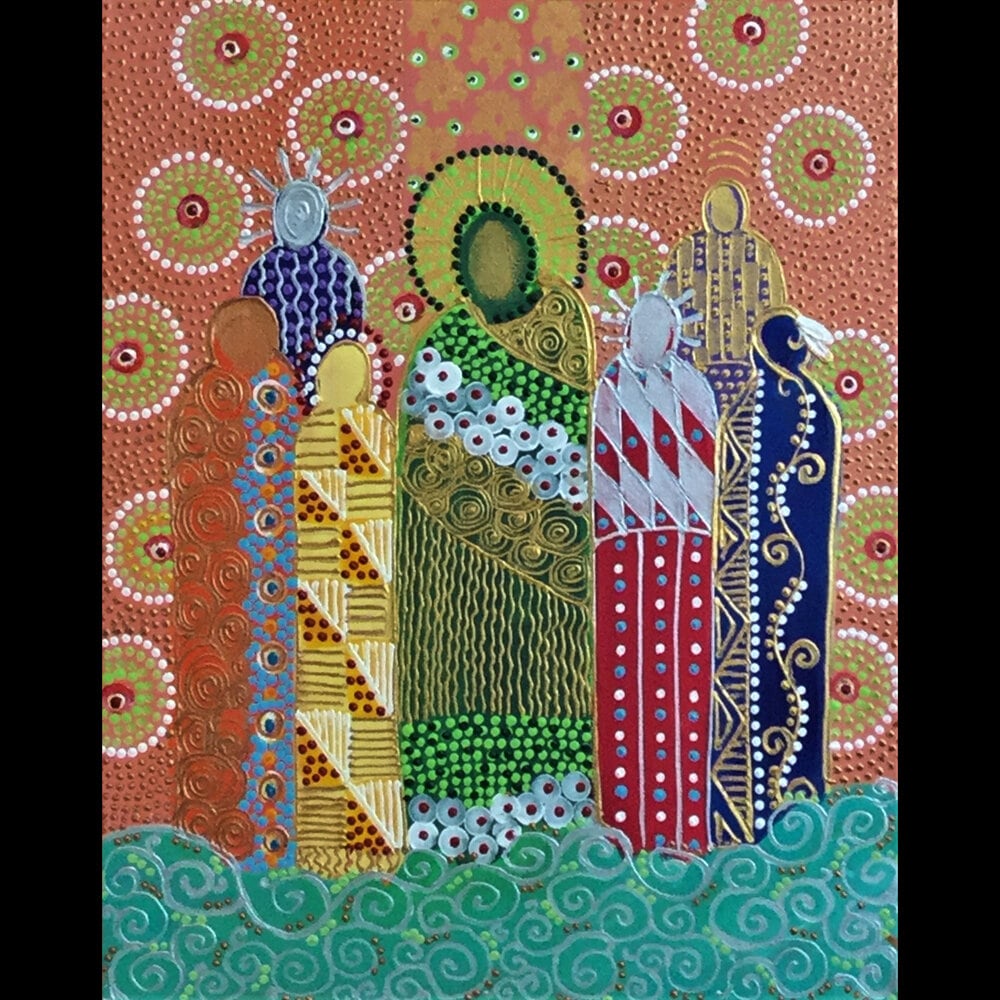 This is the painting by Vickie Krudwig. This artwork shows the fourth chakra. This is one of seven paintings.