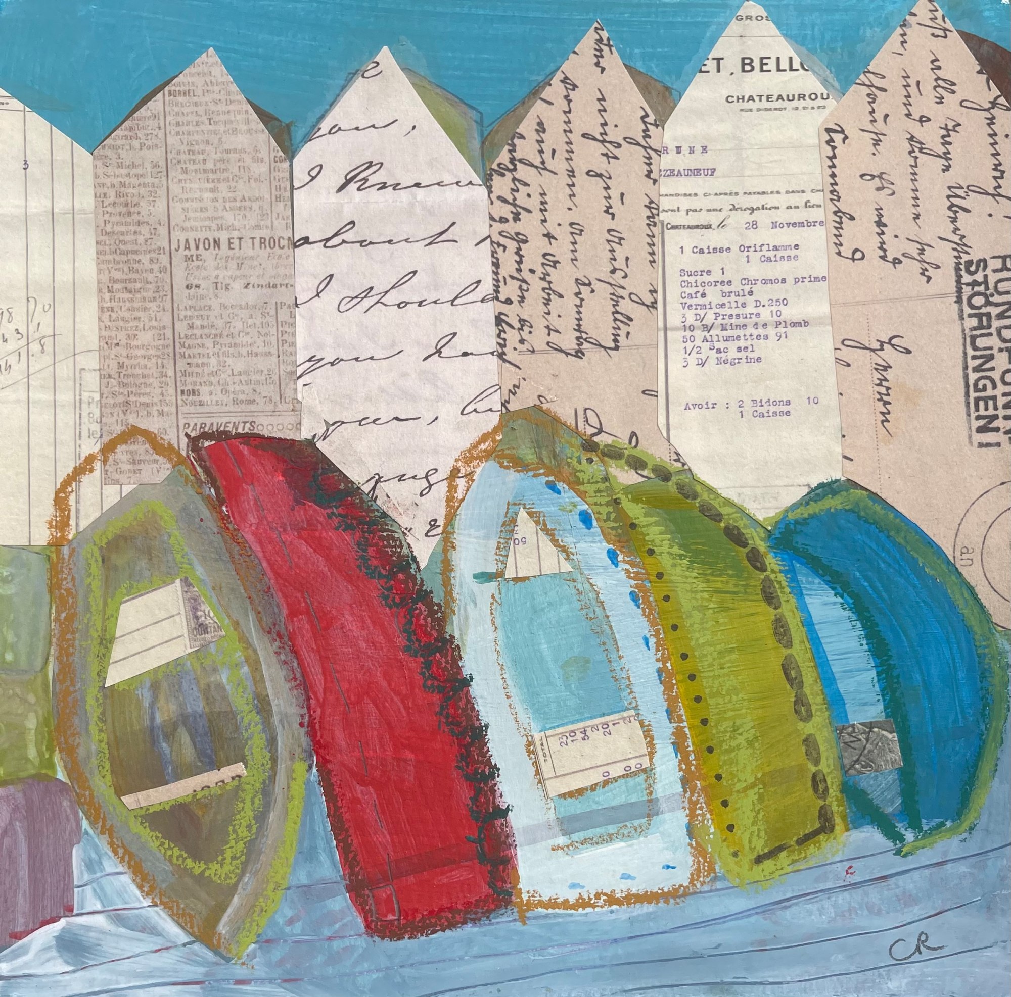 Boats stacked, waiting for their adventures against a backdrop of townhouses that overlook the water. This painting was created from my imagination but inspired by the coastline close to where I live in Brightlingsea on the Essex coast.