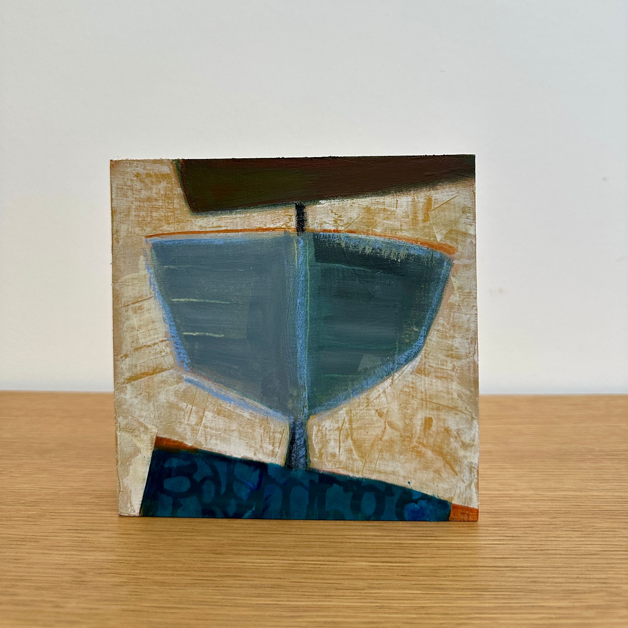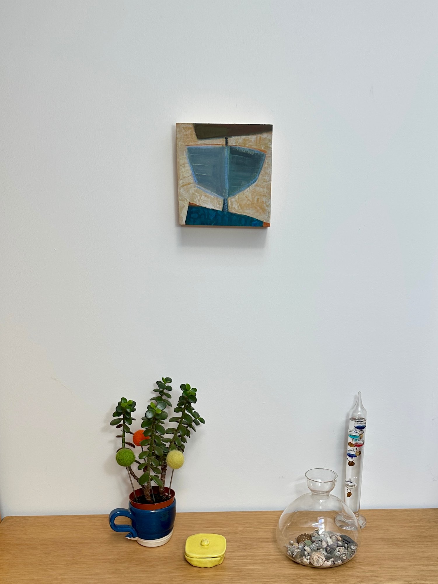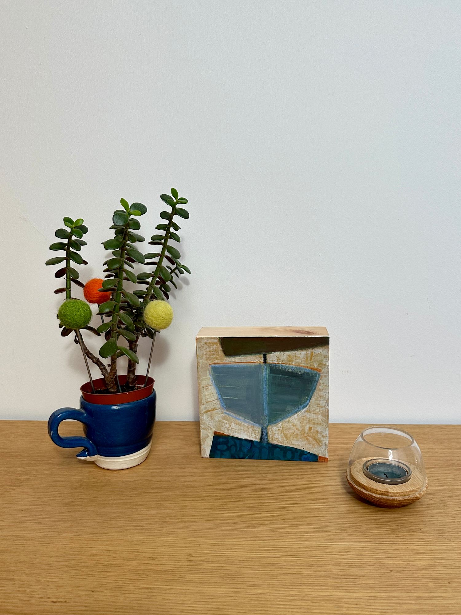 An abstract image of a grey boat. This is painted on wood ready it can hang on the wall or be placed on a shelf. It is inspired by the boats where I live in Brightlingsea but painted from my imagination.