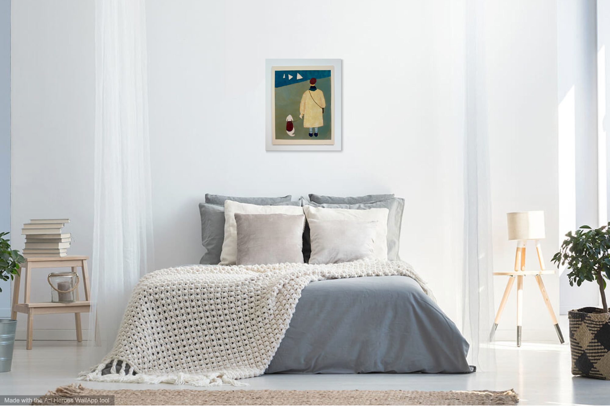 Painting from imagination but inspired by a woman I saw with her dog. The sailing ships are a nod to a painting by Mary Fedden. This is on paper in a mount ready to frame.