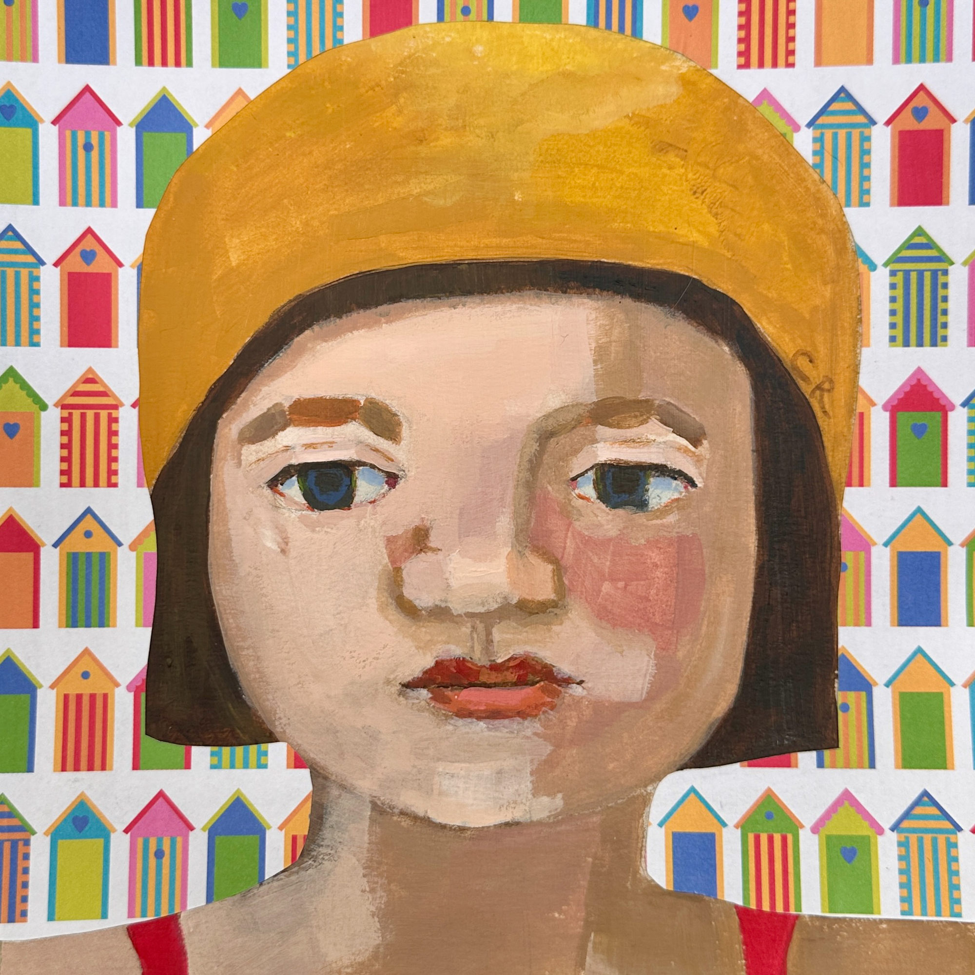 This is Maeve enjoying a day by the sea against a backdrop of colourful beach huts. This painting will bring colour and fun to your room. This painting was created from my imagination but inspired by photographs of swimmers in days gone by and people I see by the Marina in Brightlingsea.